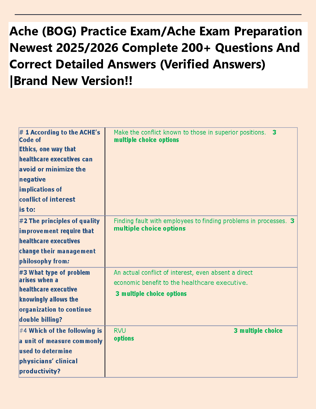 Prepare to ace the American College of Healthcare Executives (ACHE) Board of Governors (BOG) exam with our latest 2025-2026 test bank. This comprehensive resource is expertly designed to help you pass on your first attempt and avoid costly resits. Inside, you'll find over 200 meticulously crafted practice questions, each paired with a correct, detailed, and verified answer. This brand-new version covers all essential topics, ensuring you are fully prepared for the real exam. Master the material, build your confidence, and achieve your certification goals with this essential study guide.