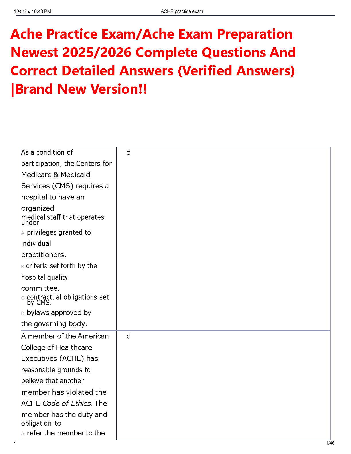 ACHE Exam Test Bank 2025/2026 - Complete Practice Questions and Verified Answers for FACHE Certification Success