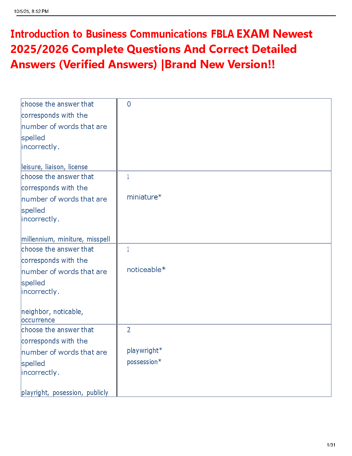Prepare to ace your Future Business Leaders of America (FBLA) exam in Introduction to Business Communications with our latest 2025/2026 test bank. This comprehensive resource is meticulously compiled with a complete set of questions and expertly verified answers, providing detailed explanations for each solution. Designed to cover all key topics and potential exam questions, this study guide is your ultimate tool for success. Master the concepts, practice with real exam-style questions, and walk into your test with the confidence to pass on your very first attempt. Say goodbye to exam anxiety and the possibility of resits by using this brand new, up-to-date preparation material.