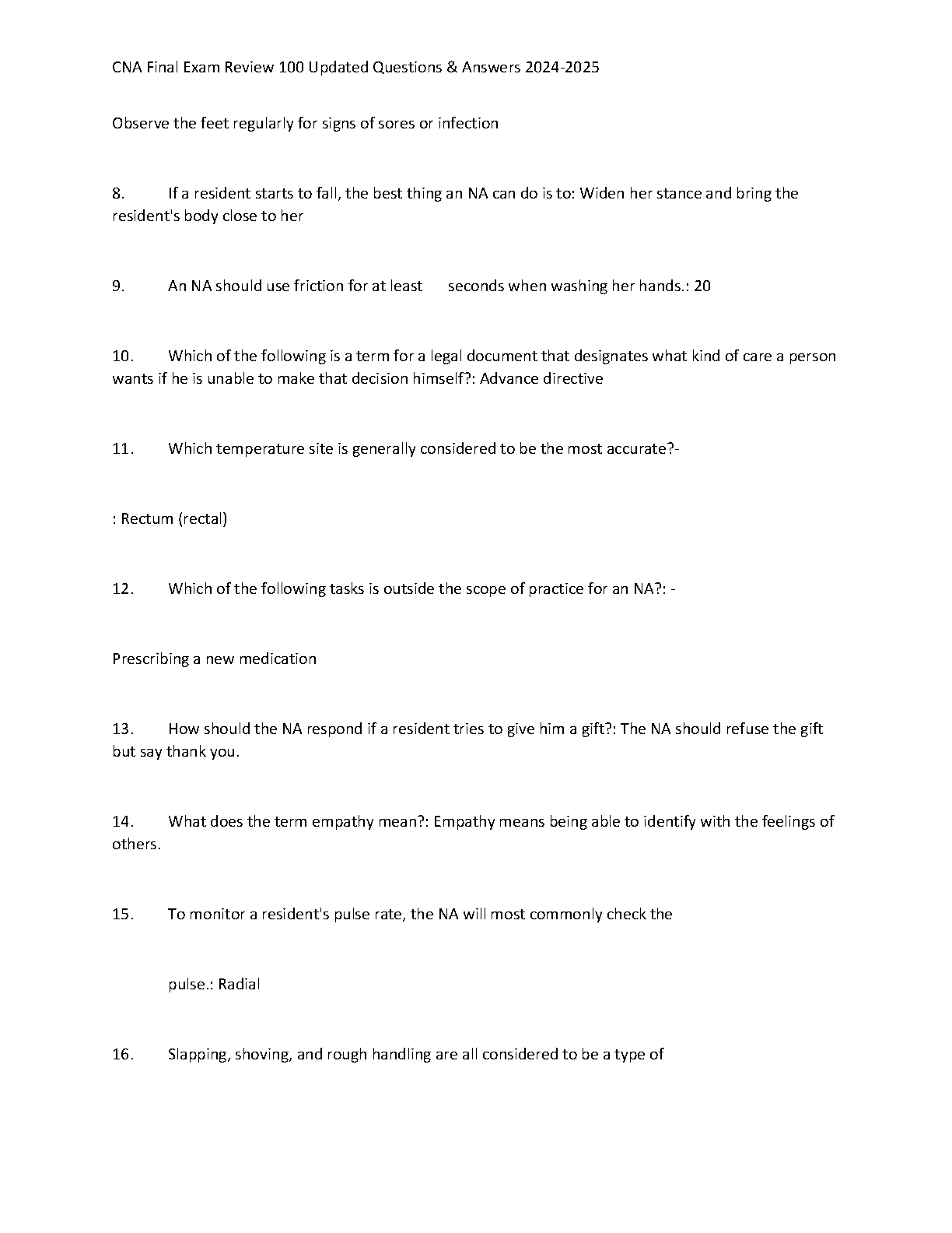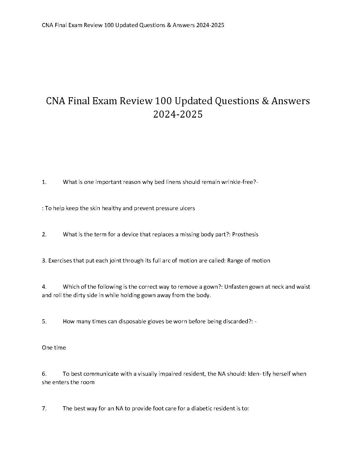 CNA Final Exam Review 2024-2025: Comprehensive Test Bank with 100 Questions and Verified Answers