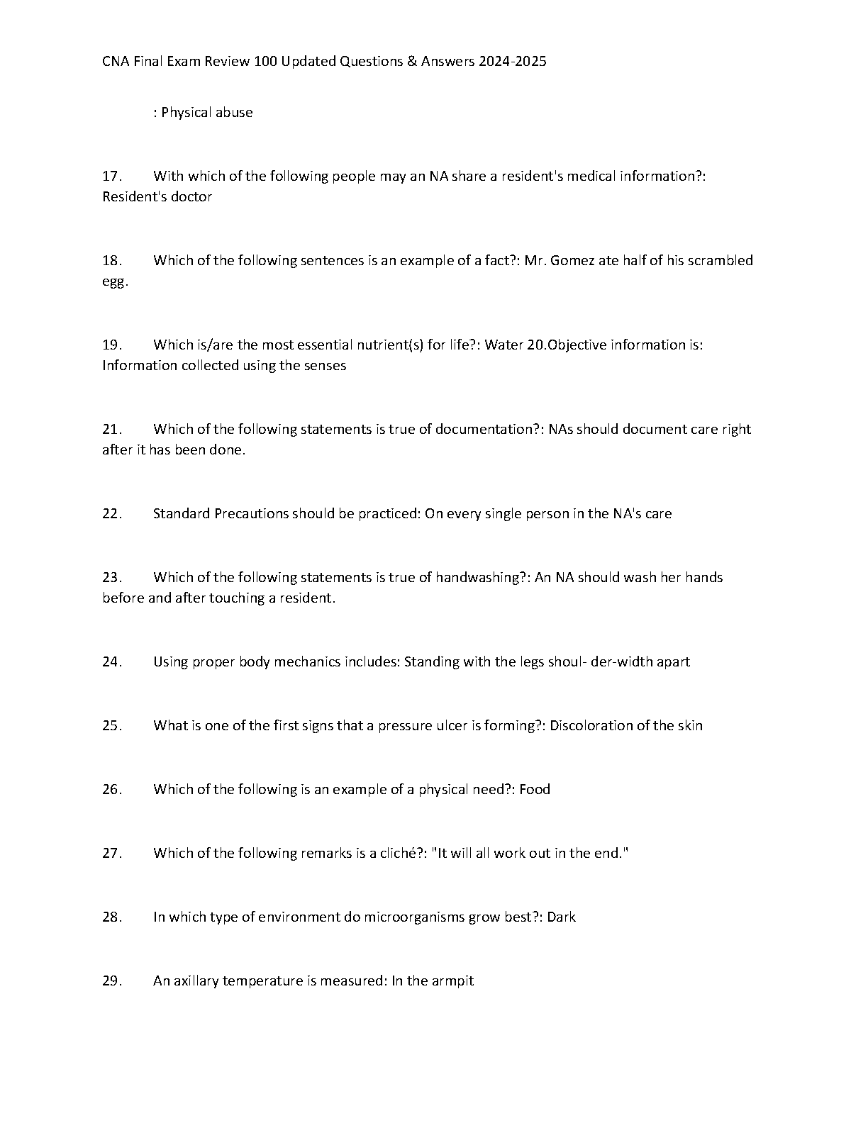 Ace your Certified Nursing Assistant (CNA) final exam with our comprehensive test bank for the 2024-2025 academic year. This essential study guide features 100 meticulously updated questions, each paired with a verified and accurate answer. Designed to cover all critical topics you'll face on the exam, this review tool is your key to mastering the material, boosting your confidence, and achieving a passing grade on your first attempt. Prepare effectively and step into your exam ready for success!