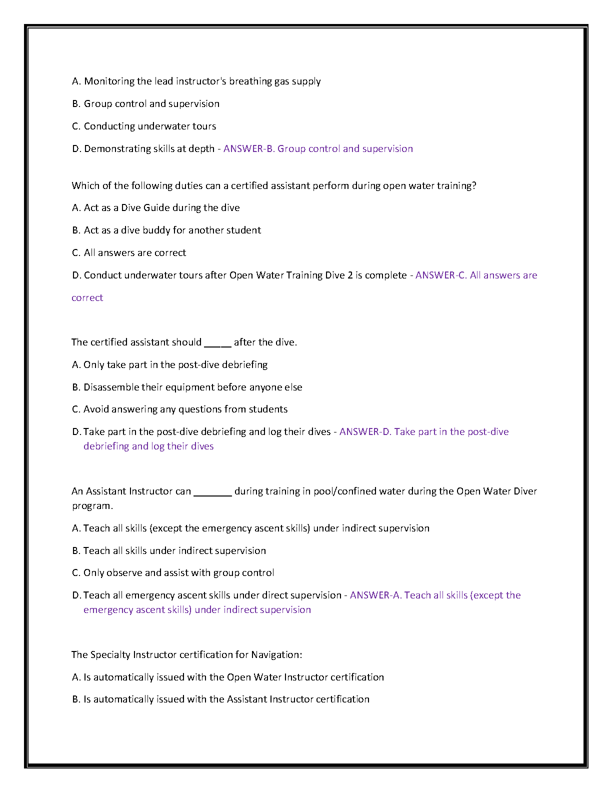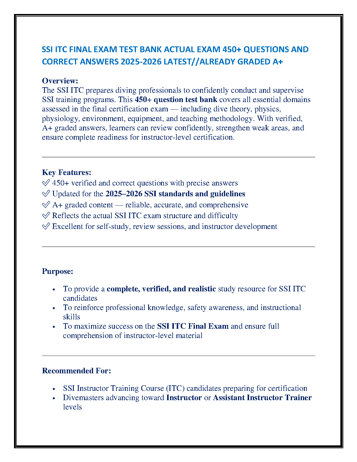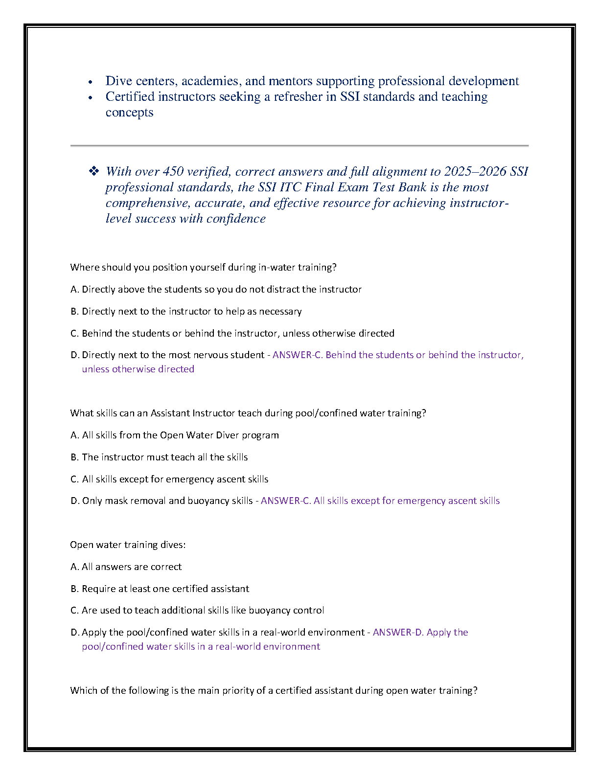 Prepare to ace your Scuba Schools International (SSI) Instructor Training Course (ITC) final exam on your first try with our comprehensive 2025-2026 test bank. This A+ graded resource features over 450 verified questions and detailed answers, covering all critical topics including dive theory, physics, physiology, environment, equipment, and teaching methods. Updated to reflect the latest SSI standards, this guide is your key to identifying knowledge gaps, reinforcing your learning, and confidently achieving your instructor-level certification. Ideal for ITC candidates and Divemasters aiming for the next level.