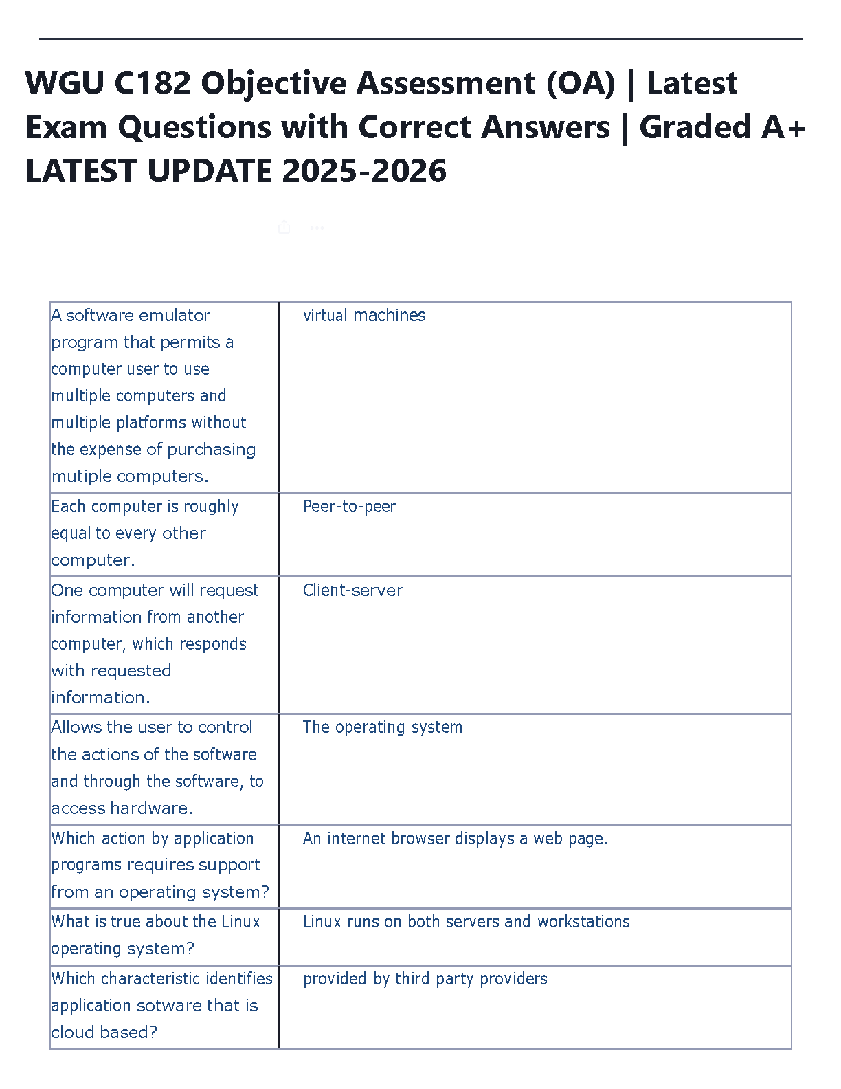 Ace your WGU C182 Introduction to IT exam on the first try with our latest 2025-2026 Objective Assessment (OA) Test Bank. This comprehensive study guide provides a complete set of verified questions and correct answers, meticulously compiled to help you master key concepts and pass with an A+. Covering essential topics like virtual machines, client-server networks, operating systems, and cloud computing, this resource is your key to avoiding resits and achieving academic success. Download now to study effectively and confidently.