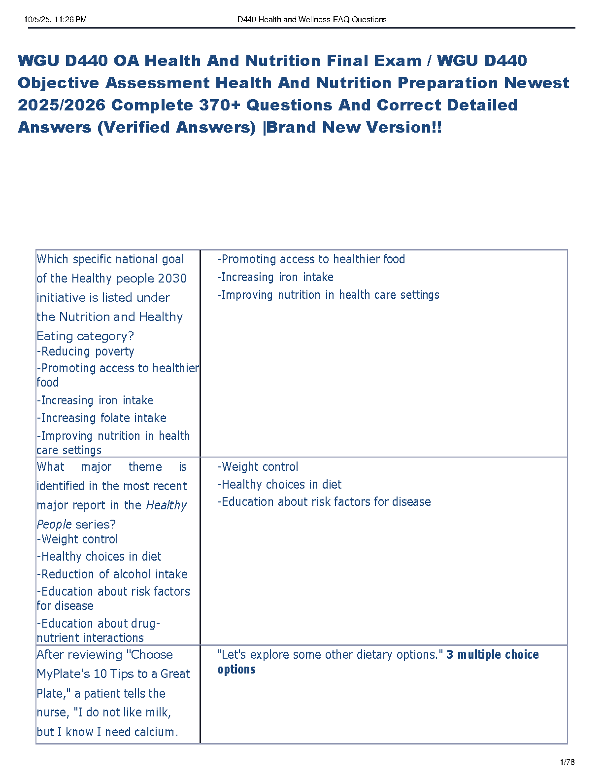 Achieve top marks in your WGU D440 Health and Nutrition course with our latest 2025/2026 Test Bank. This comprehensive resource is designed to fully prepare you for the Objective Assessment (OA) final exam. Inside, you'll find an extensive collection of over 370 practice questions, each with detailed and verified answers. Master key concepts from the curriculum, from 'Healthy People 2030' initiatives to dietary choices, and confidently tackle your exam. This is the ultimate study tool to help you pass D440 on your first try and avoid resits. Get immediate access to the brand new version and start studying smarter!