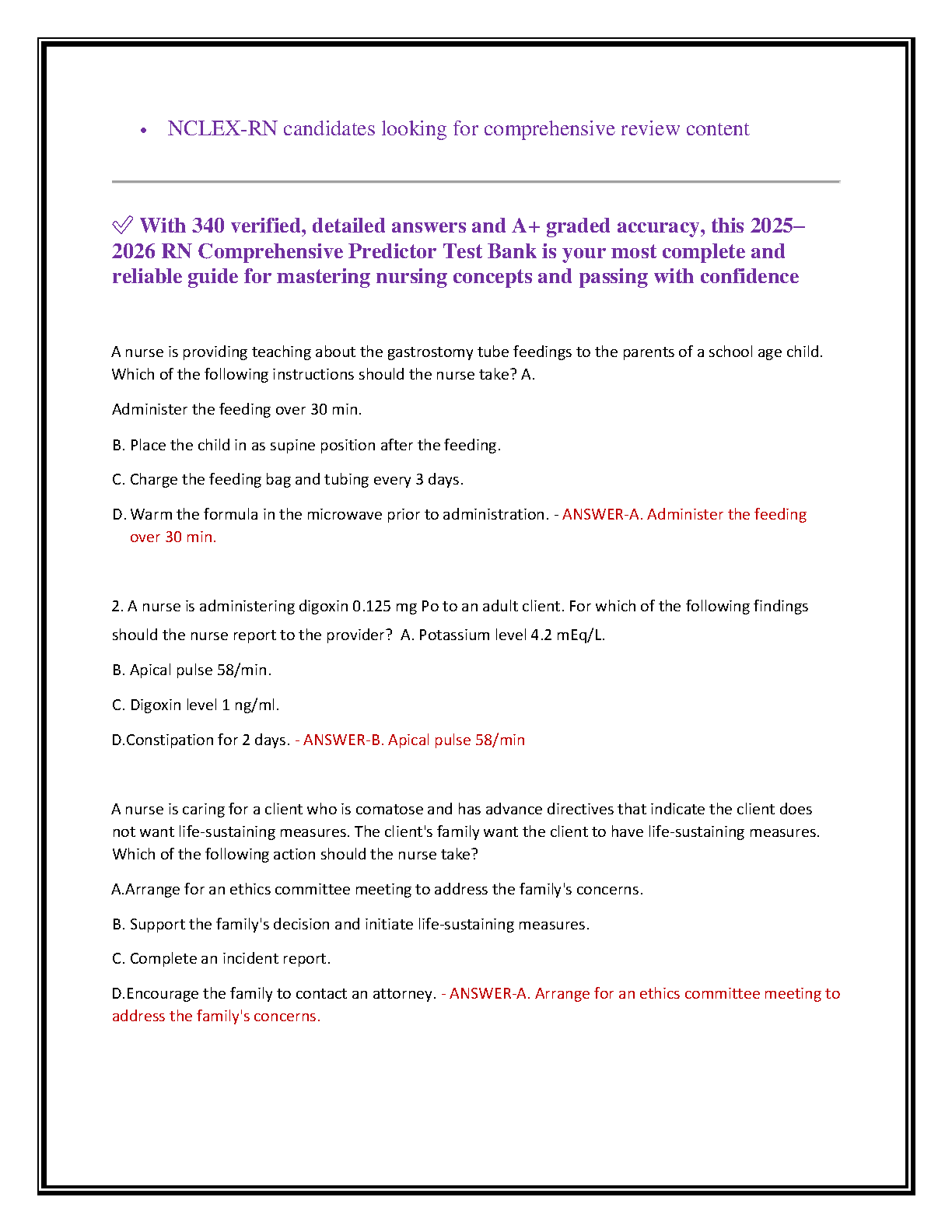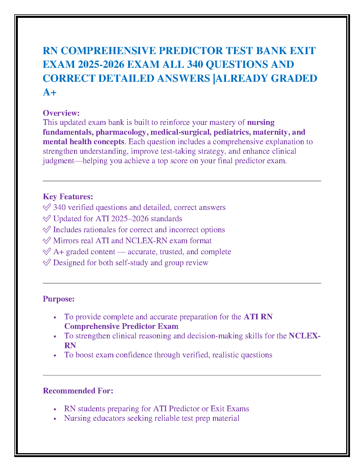 Ace your nursing exit exams with the latest 2025-2026 ATI RN Comprehensive Predictor Test Bank. This essential study guide features 340 meticulously verified questions, each paired with detailed answers and comprehensive rationales to solidify your understanding. Designed to mirror the actual ATI and NCLEX-RN exam formats, this A+ graded resource covers all critical nursing areas including fundamentals, pharmacology, medical-surgical, pediatrics, maternity, and mental health. Sharpen your clinical judgment, perfect your test-taking strategies, and walk into your predictor exam with the confidence to succeed. Ideal for both individual self-study and group review sessions.
