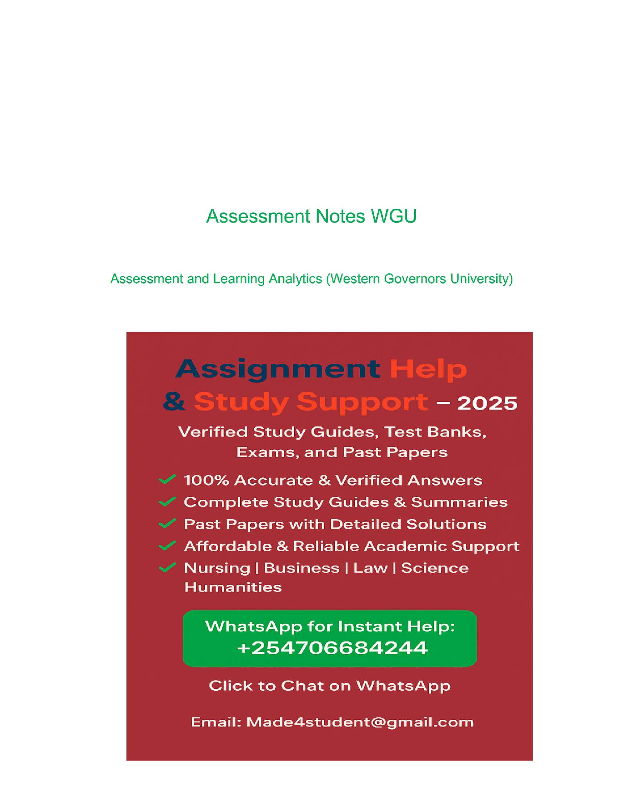 Master your Assessment and Learning Analytics course at Western Governors University with our latest 2025/2026 study resource. This comprehensive package includes a verified test bank, detailed assessment notes, and complete study guides, all designed to help you ace your exams on the first try. Gain access to 100% accurate and verified answers, in-depth summaries, and past papers with step-by-step solutions. Stop stressing about resits and secure your success with this reliable and affordable academic support.