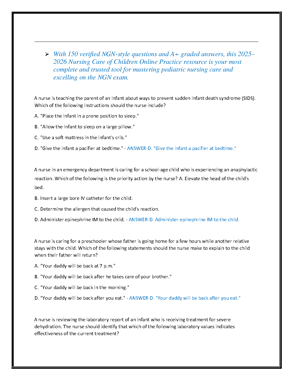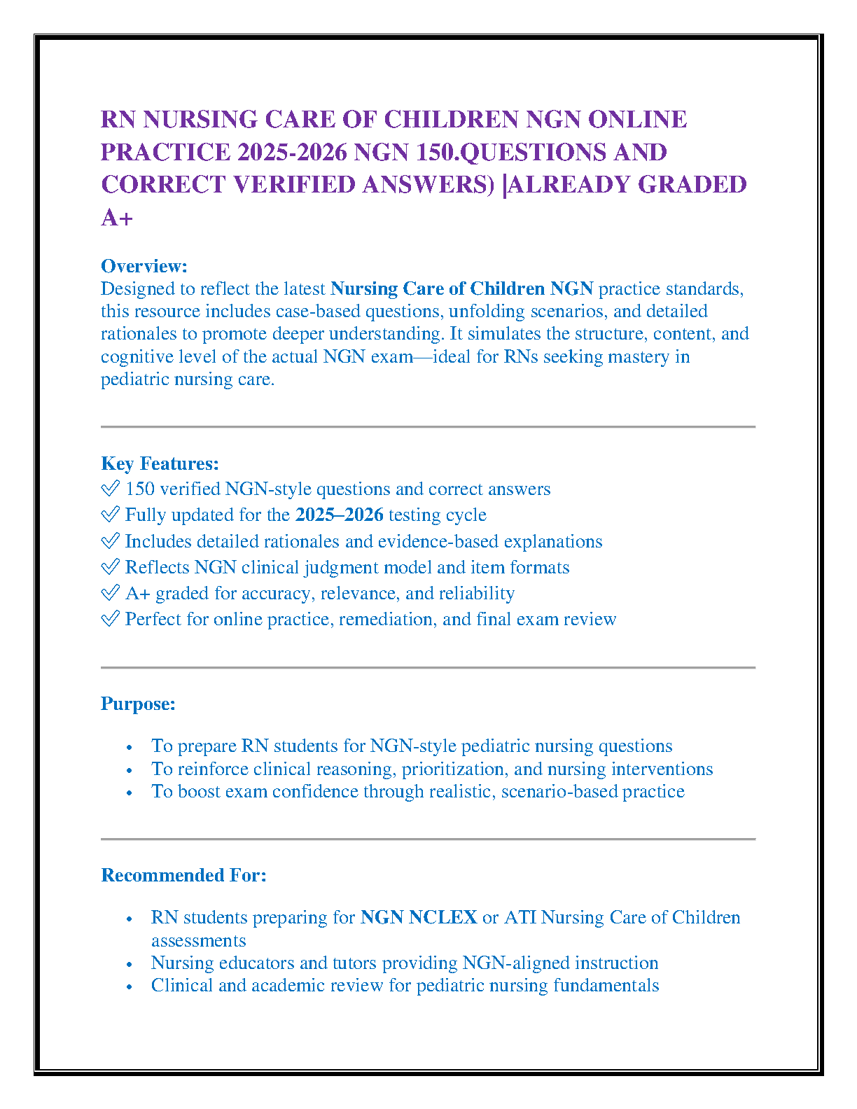 Ace your pediatric nursing exams with our comprehensive NGN Nursing Care of Children Test Bank, fully updated for the 2025-2026 academic year. This A+ graded resource is meticulously designed to help you pass the NGN NCLEX or ATI exams on your very first attempt. Inside, you will find 150 verified NGN-style questions presented as case-based, unfolding scenarios, complete with detailed, evidence-based rationales that promote deep understanding and critical thinking. This study guide perfectly simulates the structure and cognitive demands of the actual NGN exam, making it your ultimate tool to reinforce clinical reasoning, master prioritization, and boost your confidence. Ideal for RN students and educators seeking a reliable resource to master pediatric nursing.