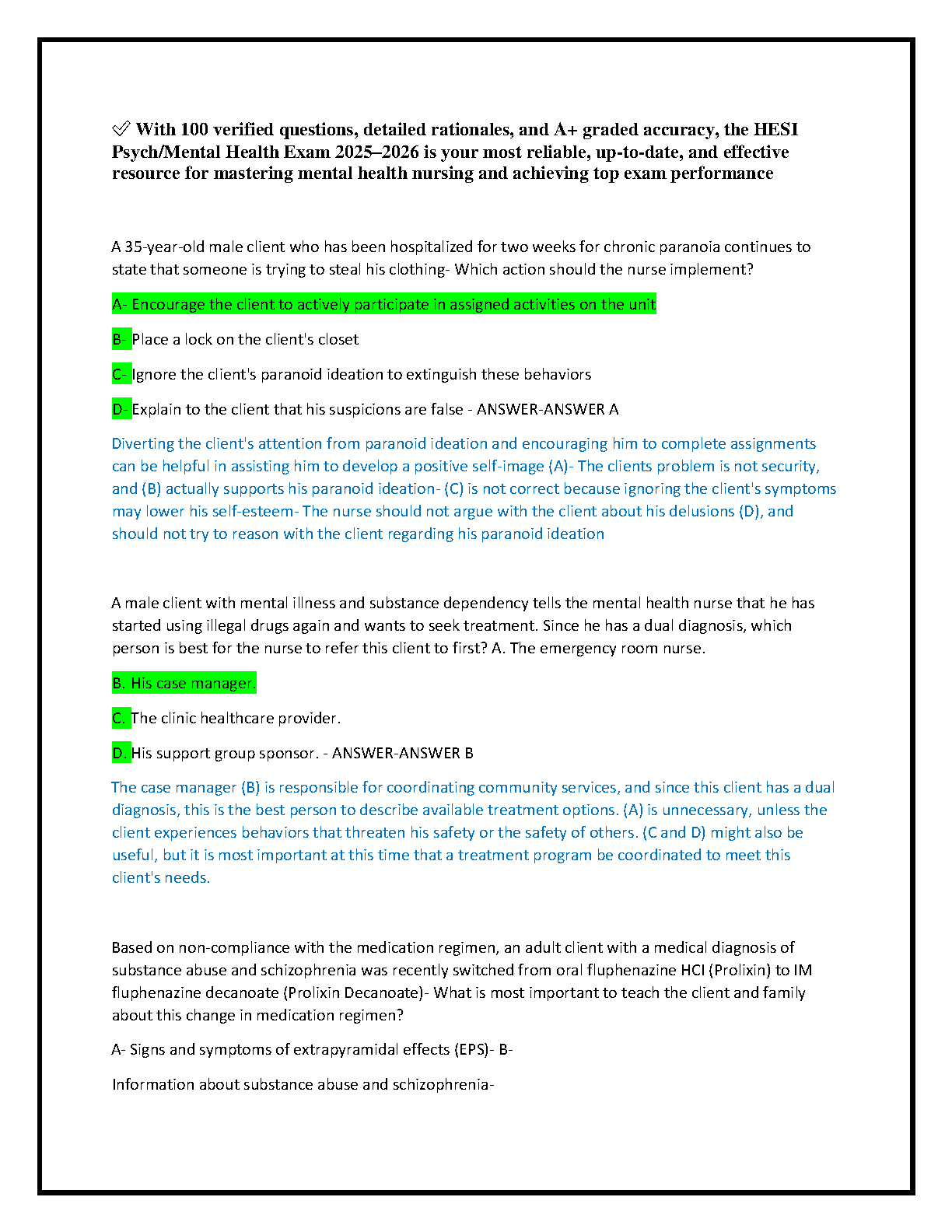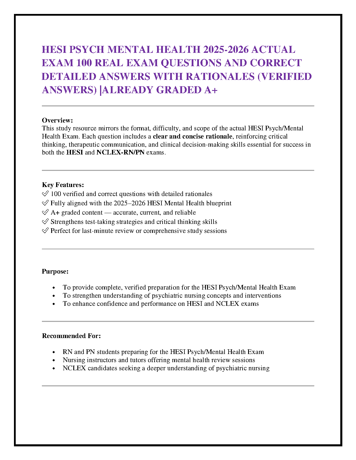 Prepare to ace your HESI Psych/Mental Health exam with our comprehensive 2025-2026 study guide, designed to help you pass on your very first attempt! This resource contains 100 authentic, A+ graded exam questions, each paired with a clear and detailed rationale to deepen your understanding of key psychiatric nursing concepts. Fully aligned with the latest 2025-2026 HESI blueprint, this guide mirrors the actual exam's format and difficulty, strengthening your critical thinking and test-taking skills. Whether you're an RN or PN student looking for a thorough review or a last-minute study session, this guide is your key to building confidence and achieving success on both the HESI and NCLEX exams.