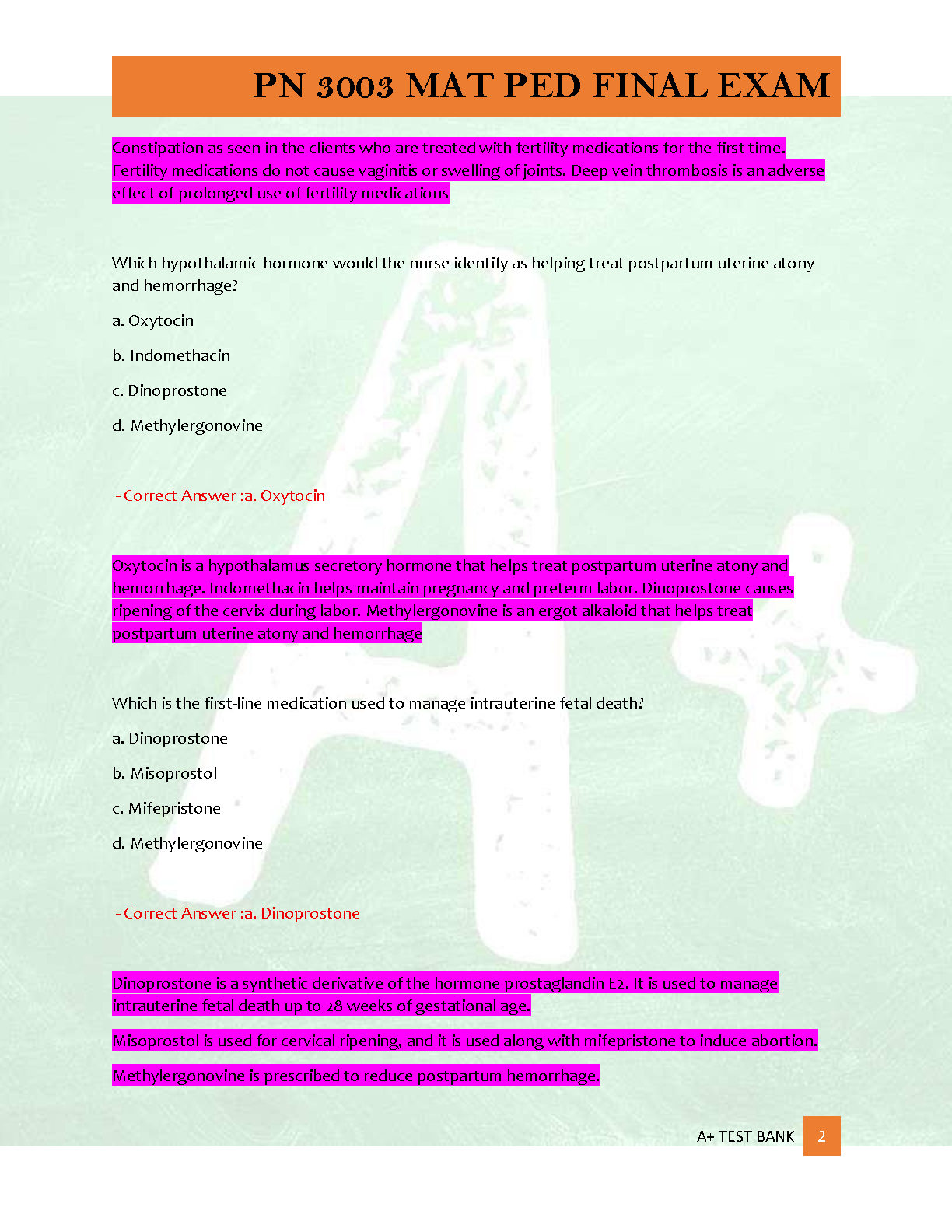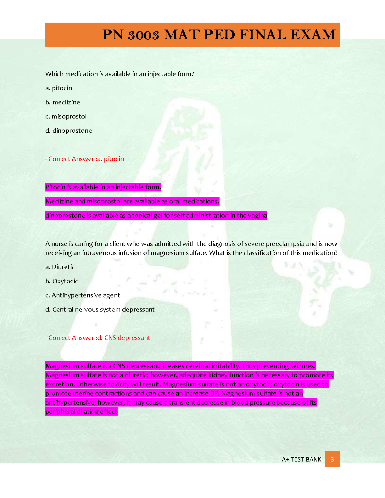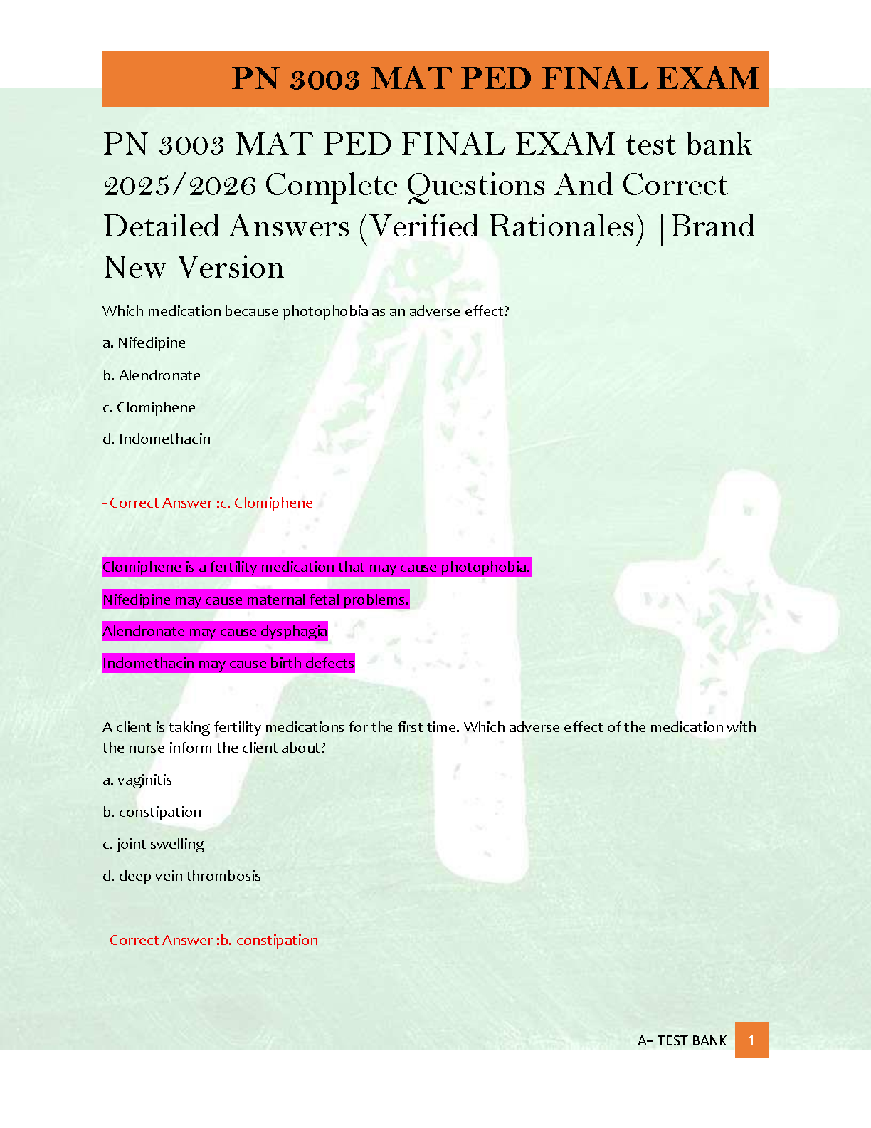 Ace your PN 3003 Maternal and Pediatric Nursing final exam with our brand-new 2025/2026 test bank! This comprehensive resource is packed with a complete set of exam questions, each accompanied by a correct, detailed answer and a verified rationale. Our A+ graded study guide is expertly designed to help you master key concepts, understand the reasoning behind each answer, and walk into your exam with confidence. Stop cramming and start learning effectively. Download now to fully prepare and secure the top grade you deserve on your MAT PED final.