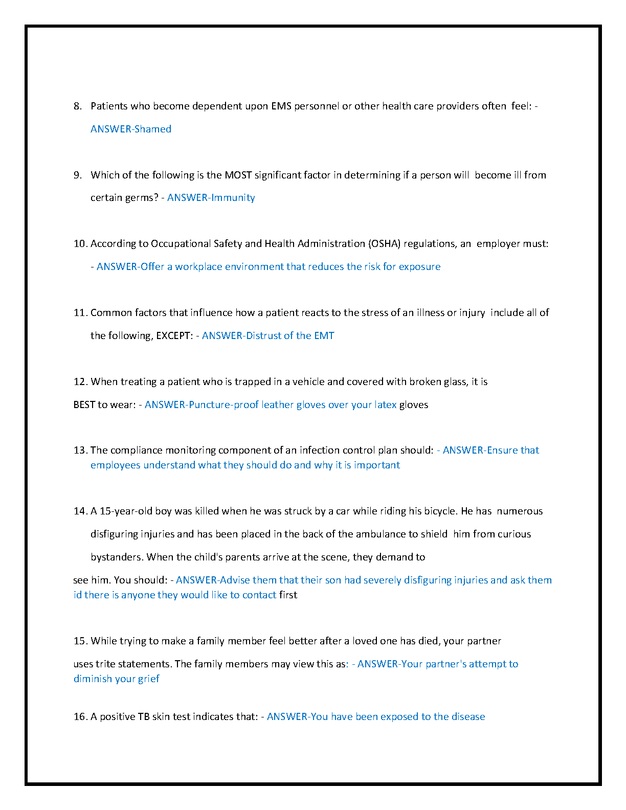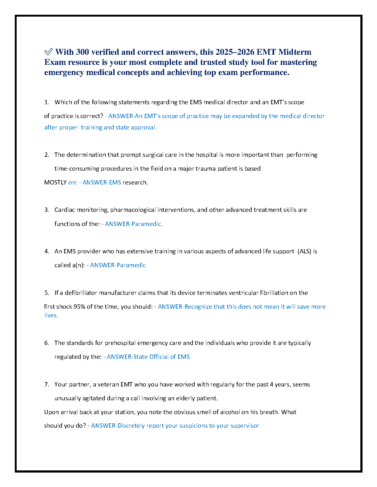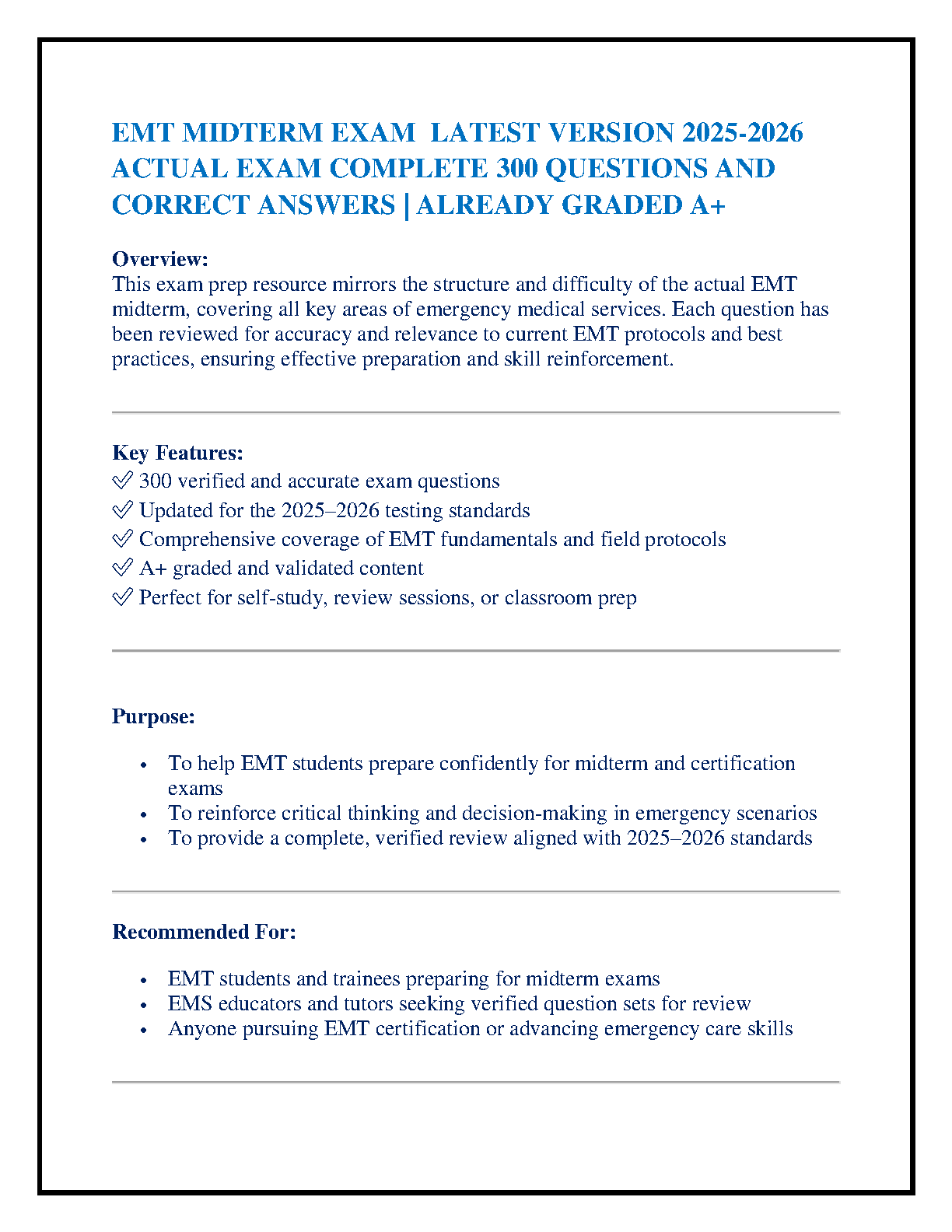 Excel in your EMT program with our premier test bank for the 2025-2026 EMT Midterm Exam. This essential study guide features a complete collection of 300 meticulously verified questions, each paired with a correct, A+ graded answer. Designed to perfectly simulate the real exam's format and difficulty, this resource covers all critical areas of EMT fundamentals and field protocols. Updated for the latest 2025-2026 standards, it's the ultimate tool for self-study, group reviews, and ensuring you pass your exam on the first try. Boost your knowledge, reinforce your skills, and walk into your midterm fully prepared.