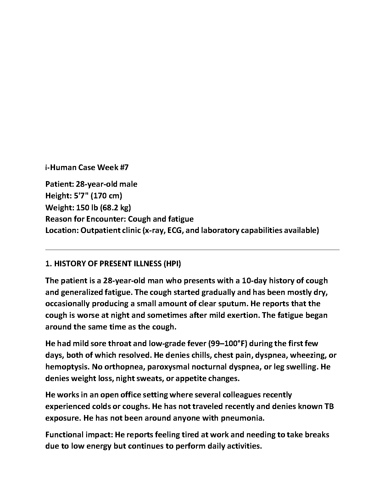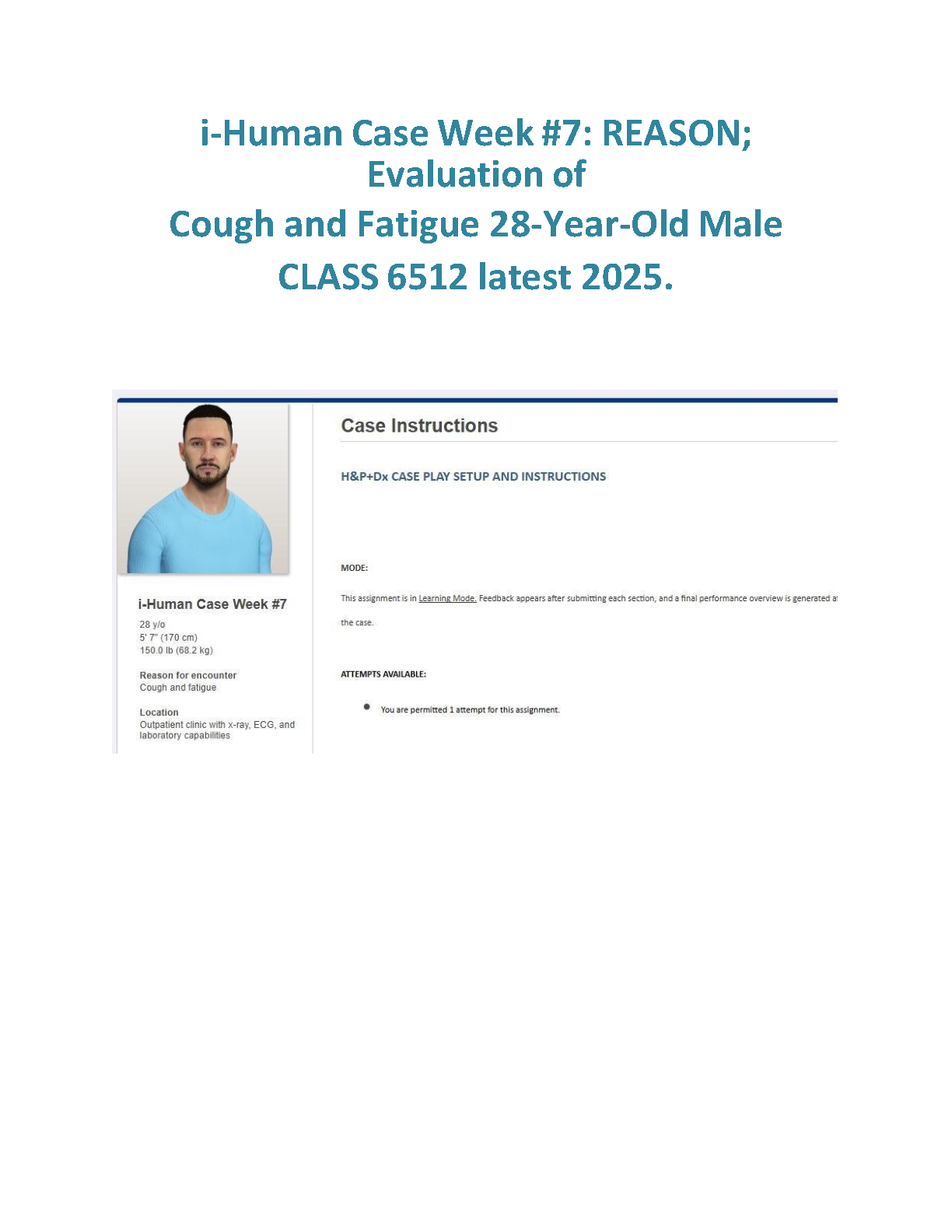 Master your clinical reasoning skills with the latest 2025/2026 edition of the i-Human Case for CLASS 6512, Week 7. This comprehensive guide walks you through the complete evaluation of a 28-year-old male presenting with cough and fatigue. From history and physical (H&P) to differential diagnosis (Dx), this resource provides everything you need to excel in your assignment and pass your exams on the first attempt. Avoid resits and build confidence with this expertly crafted study aid.