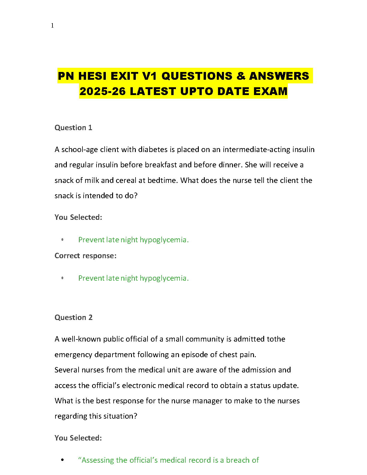 PN HESI Exit Exam V1 (Version 1) Test Bank with Questions and Answers - 2025/2026 Updated Edition