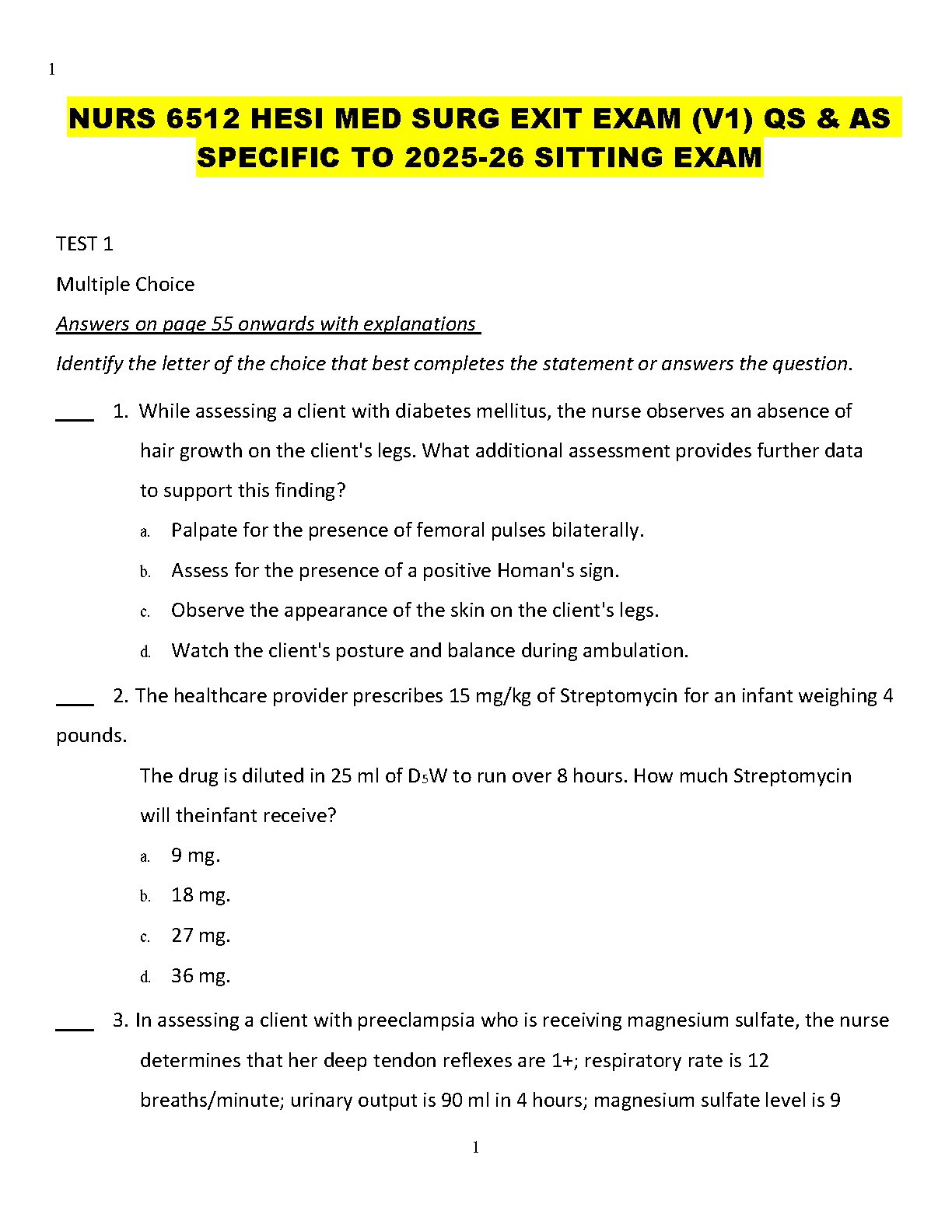 Ace your NURS 6512 HESI Med-Surg Exit Exam with confidence! This comprehensive study guide, tailored for the 2025-2026 academic year, provides a complete set of verified test bank questions (V1) and detailed, easy-to-understand answers with explanations. Master key concepts in medical-surgical nursing, from patient assessment to complex drug calculations. Our resource is designed to mirror the actual exam format, helping you build the knowledge and test-taking skills needed to pass on your very first attempt and avoid costly resits. Get immediate access to the essential preparation tool that will propel you toward nursing success.