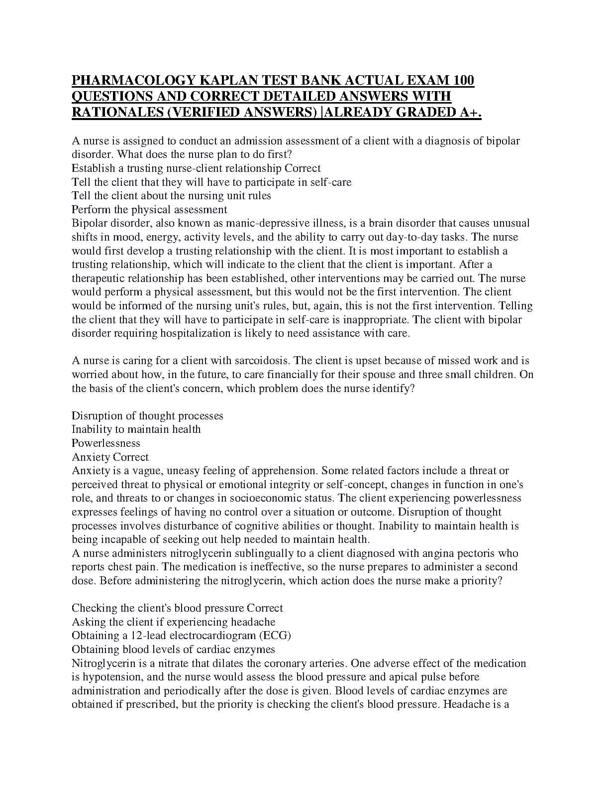 Master pharmacology and ace your nursing exams with this comprehensive Kaplan Pharmacology Test Bank. This resource features 100 actual exam-style questions, each accompanied by verified answers and in-depth rationales to deepen your understanding. Designed by the experts at Kaplan Nursing, this test bank is your ultimate study tool to conquer complex pharmacology concepts, build confidence, and ensure you pass your exams, including the NCLEX, on your very first try. Stop worrying about resits and start preparing for an A+ grade with these proven practice questions.
