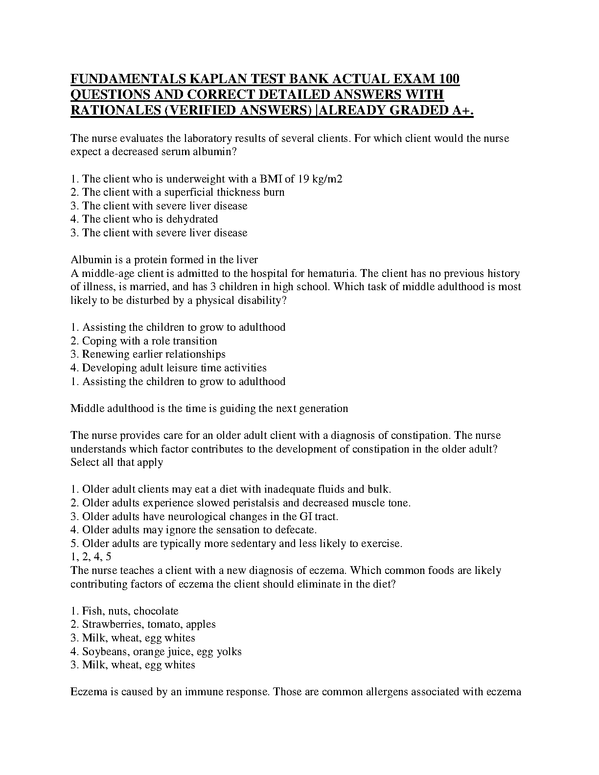 Kaplan Fundamentals of Nursing Test Bank by Kaplan Nursing | 100 Exam Questions with Verified Answers & In-depth Rationales (Graded A+)
