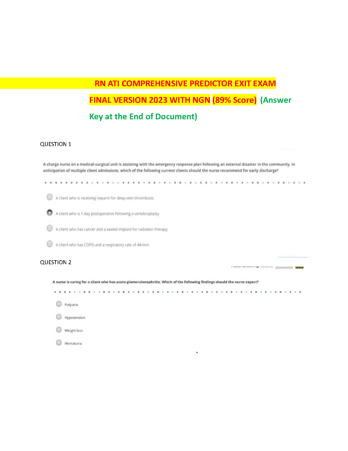 Excel in your nursing program with our definitive study guide for the RN ATI Comprehensive Predictor Exit Exam, 2023 Final Version. This comprehensive test bank is fully updated to include the latest Next Generation NCLEX (NGN) style questions, providing you with the most current and relevant practice available. This resource features a complete collection of verified questions and a detailed answer key, mirroring the actual exam format to ensure you're fully prepared. Based on a proven 89% scoring document, this guide is expertly designed to boost your confidence and help you master the material needed to pass your ATI exit exam on the first attempt. Download now for instant access and take the final step towards your RN career with confidence!