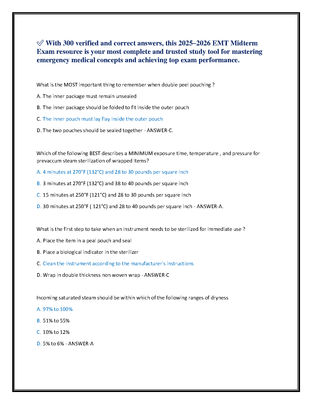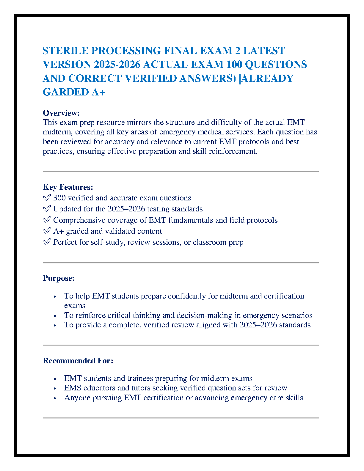 Unlock A+ results on your Sterile Processing Final Exam 2 with our fully updated 2025-2026 test bank. This essential study guide features over 100 verified questions and correct answers, meticulously designed to reflect the real exam's structure and content. Covering all key topics such as decontamination, sterilization methods, and infection control, this resource is your ultimate tool for confident preparation. Avoid resits and pass on your first attempt. Perfect for students and aspiring certified sterile processing technicians.