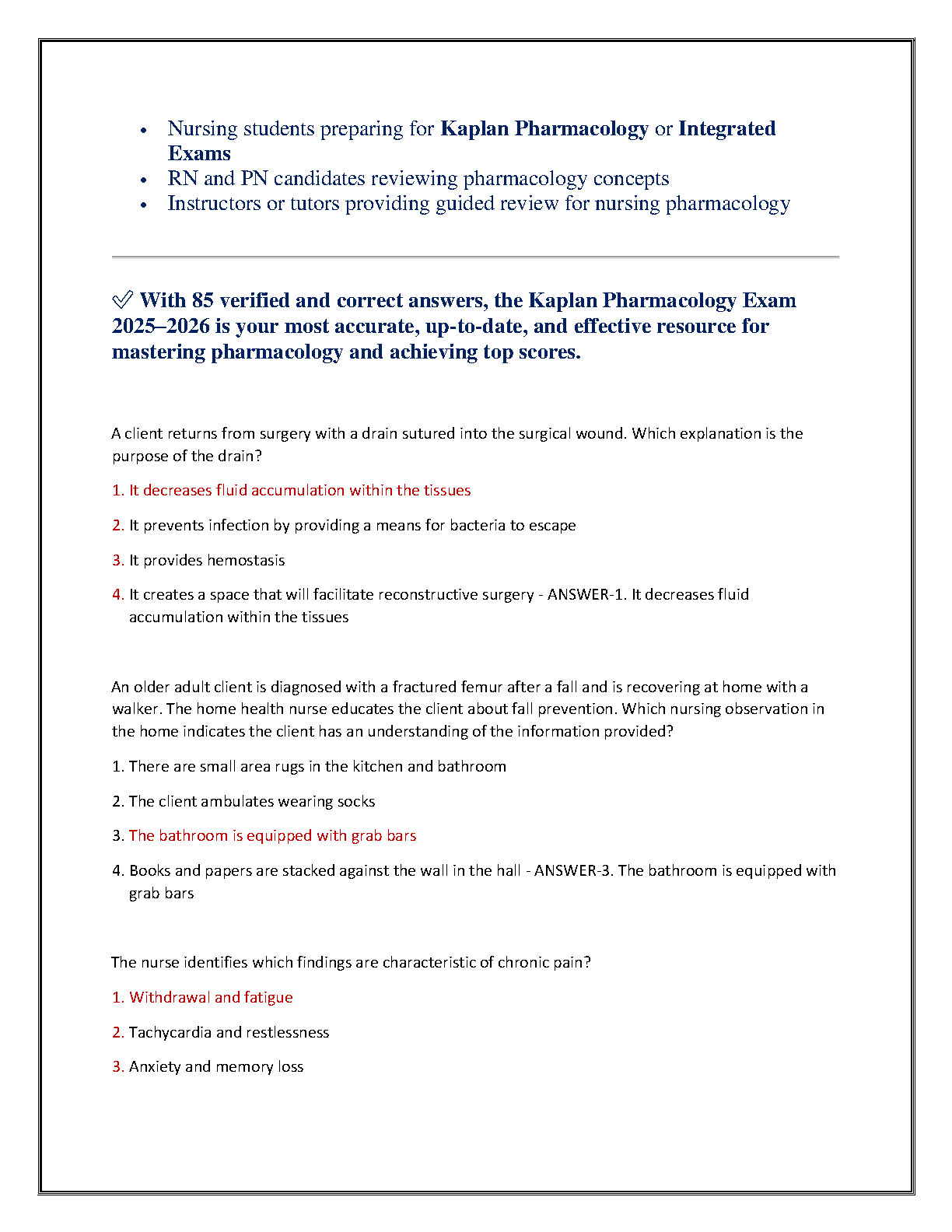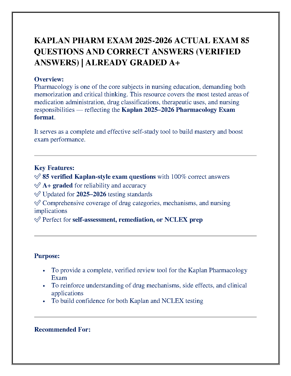 Ace your pharmacology exams with confidence using this premium test bank for the Kaplan Pharm Exam 2025-2026. Designed specifically for nursing students, this guide features 85 meticulously verified, Kaplan-style questions, complete with 100% correct, A+ graded answers. Dive deep into crucial topics including drug classifications, mechanisms of action, and essential nursing responsibilities. Updated for the latest 2025-2026 testing standards, this resource is your ultimate tool for self-assessment, remediation, and final prep for both the Kaplan exam and the NCLEX. Boost your performance and master pharmacology on your first try!