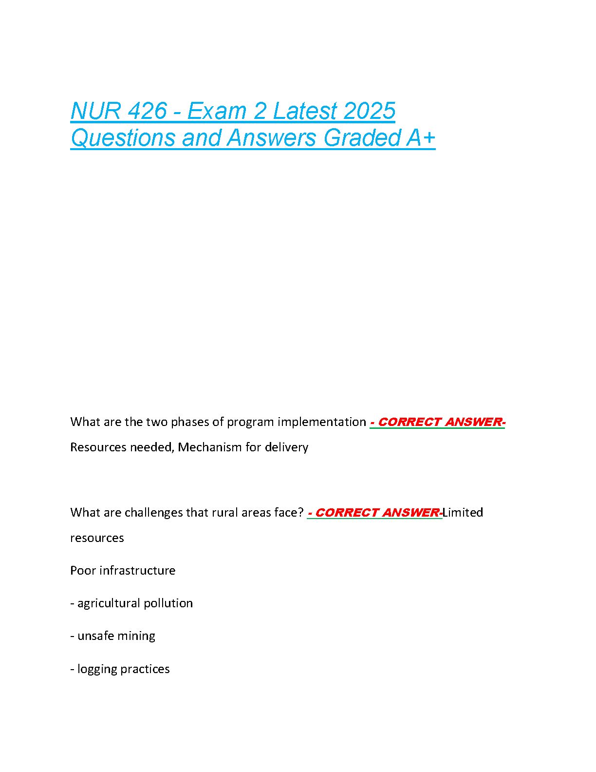 Unlock success in your Community & Population Health Nursing course with our comprehensive test bank for NUR 426 Exam 2. This latest 2025/2026 edition is your ultimate study tool, featuring a complete collection of verified exam questions and detailed, accurate answers. Designed to help you master key concepts such as program implementation and rural health challenges, this guide ensures you are fully prepared. Stop worrying about resits and aim for an A+! Download now to study smart and pass your NUR 426 exam on the first attempt.
