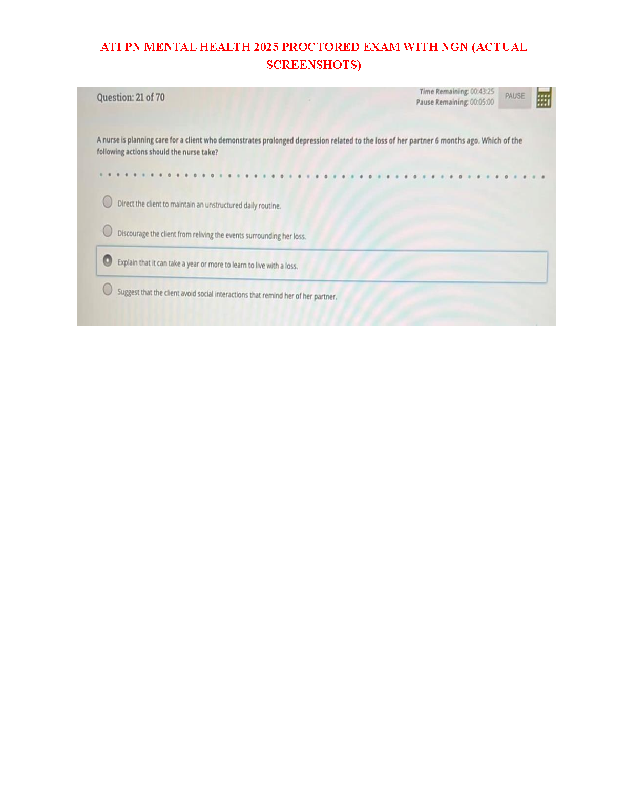 Get fully prepared for your nursing exams with our latest 2025 ATI PN Mental Health Proctored Exam Test Bank. This essential study resource, updated for the 2025/2026 academic year, features actual exam screenshots and a complete collection of Next Generation (NGN) style questions with verified answers. Designed specifically for practical nursing students, this guide covers all critical topics in mental health nursing, ensuring you have the knowledge and confidence to pass the ATI proctored exam on your very first try. Stop worrying about resits and start mastering the material today with this comprehensive and reliable study tool.