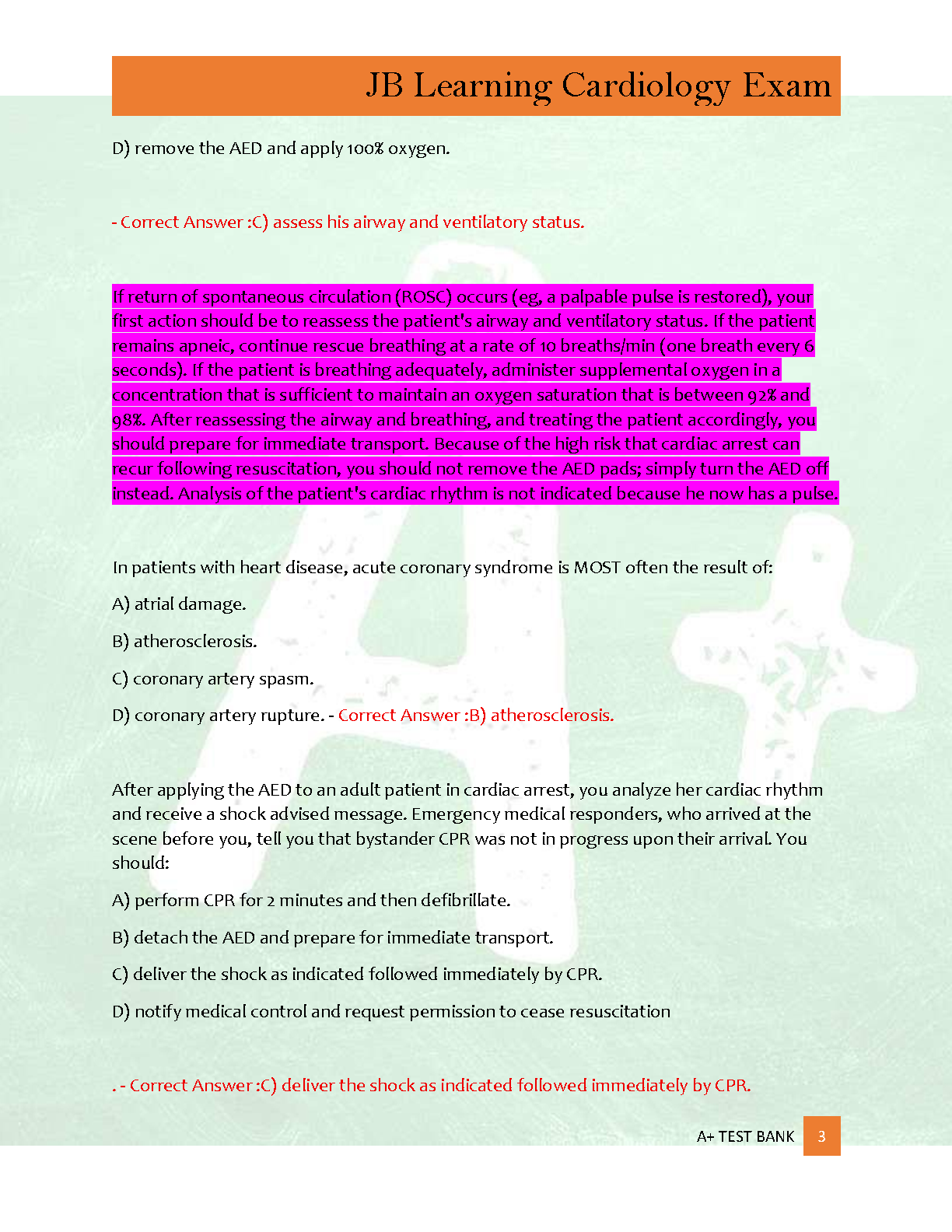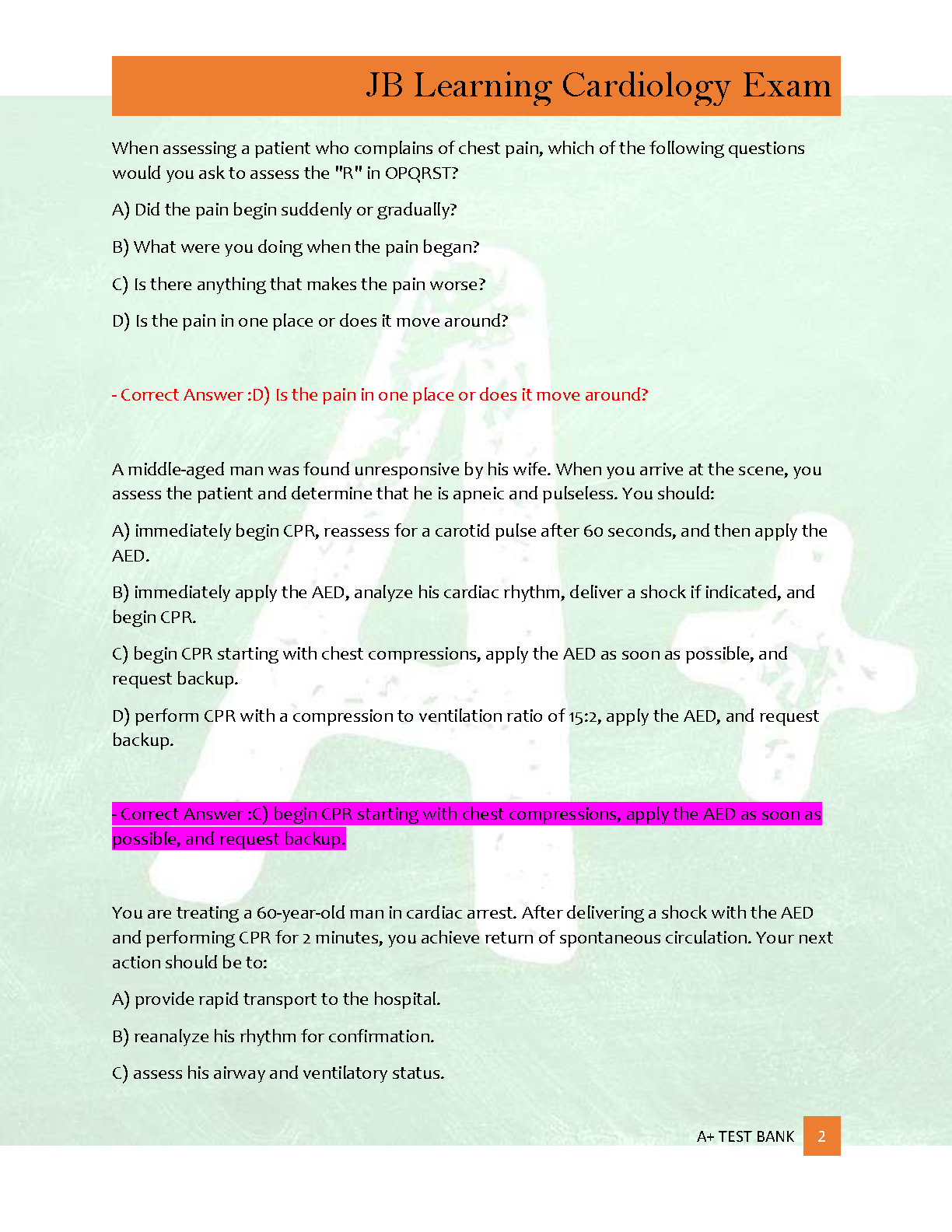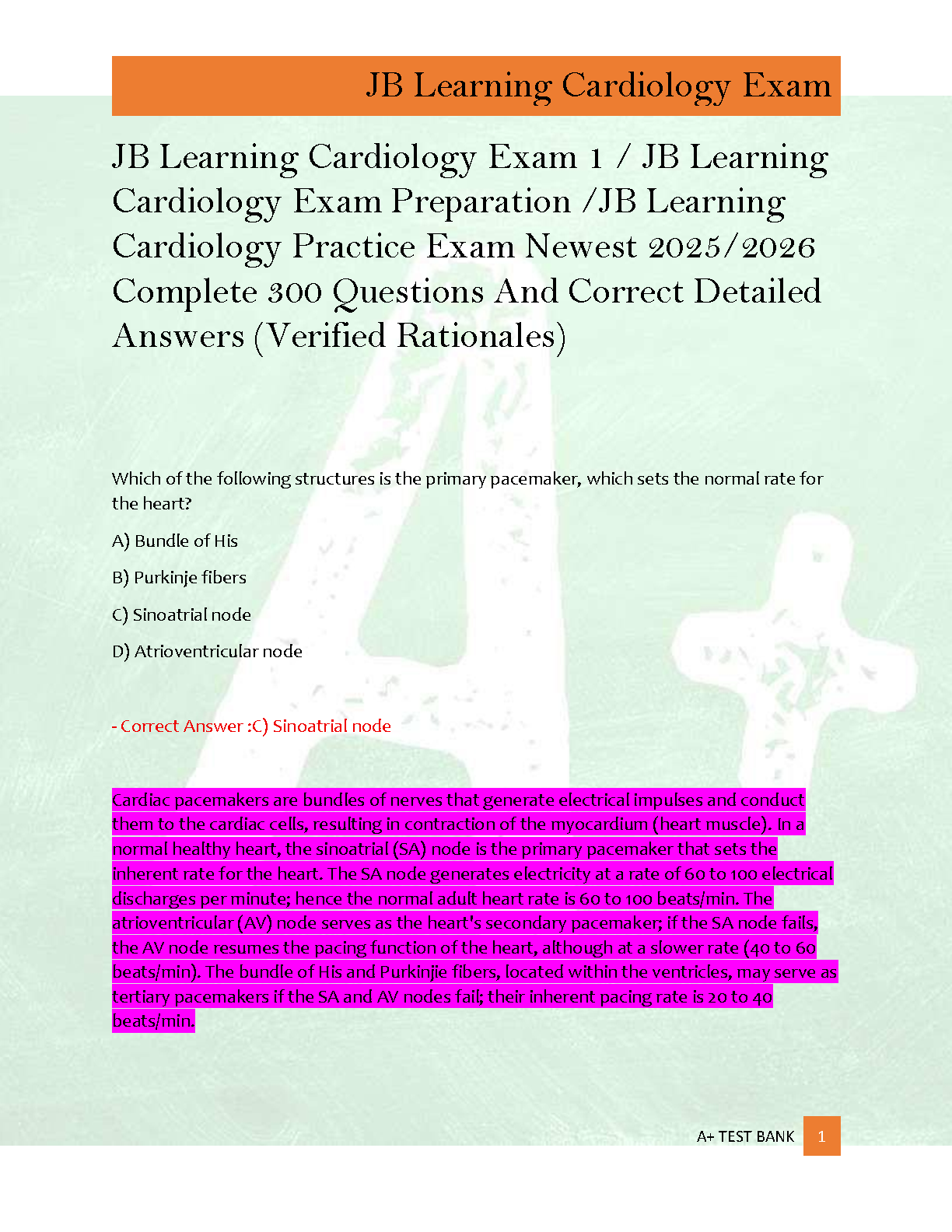 Ace your JB Learning Cardiology Exam with our latest 2025/2026 Test Bank. This comprehensive study guide features 300 practice questions complete with detailed, verified rationales for every answer. Designed to help you master critical cardiology concepts and test-taking strategies, this resource is your key to success. Prepare efficiently, build confidence, and ensure you pass your exam on the very first attempt. Get immediate access and start studying smarter today!