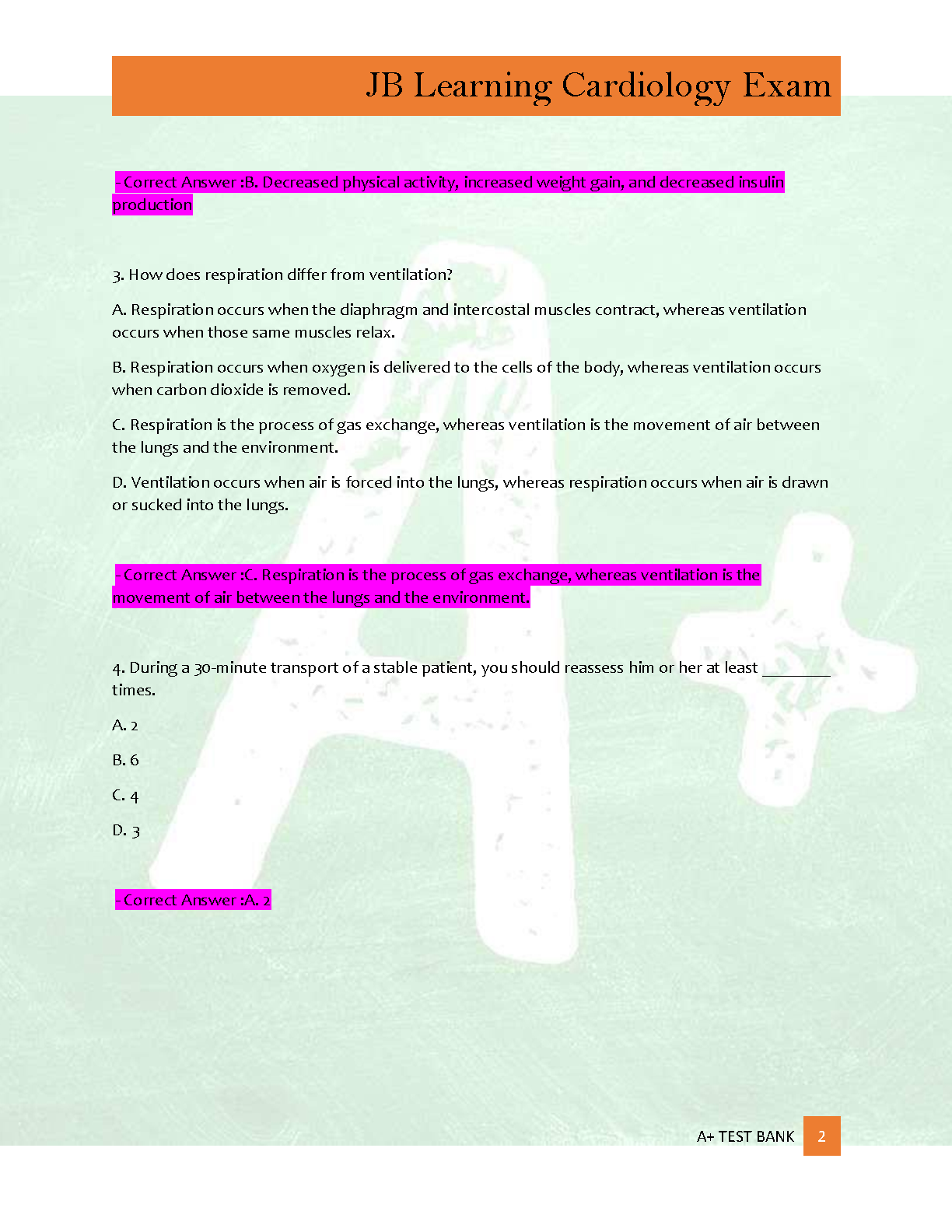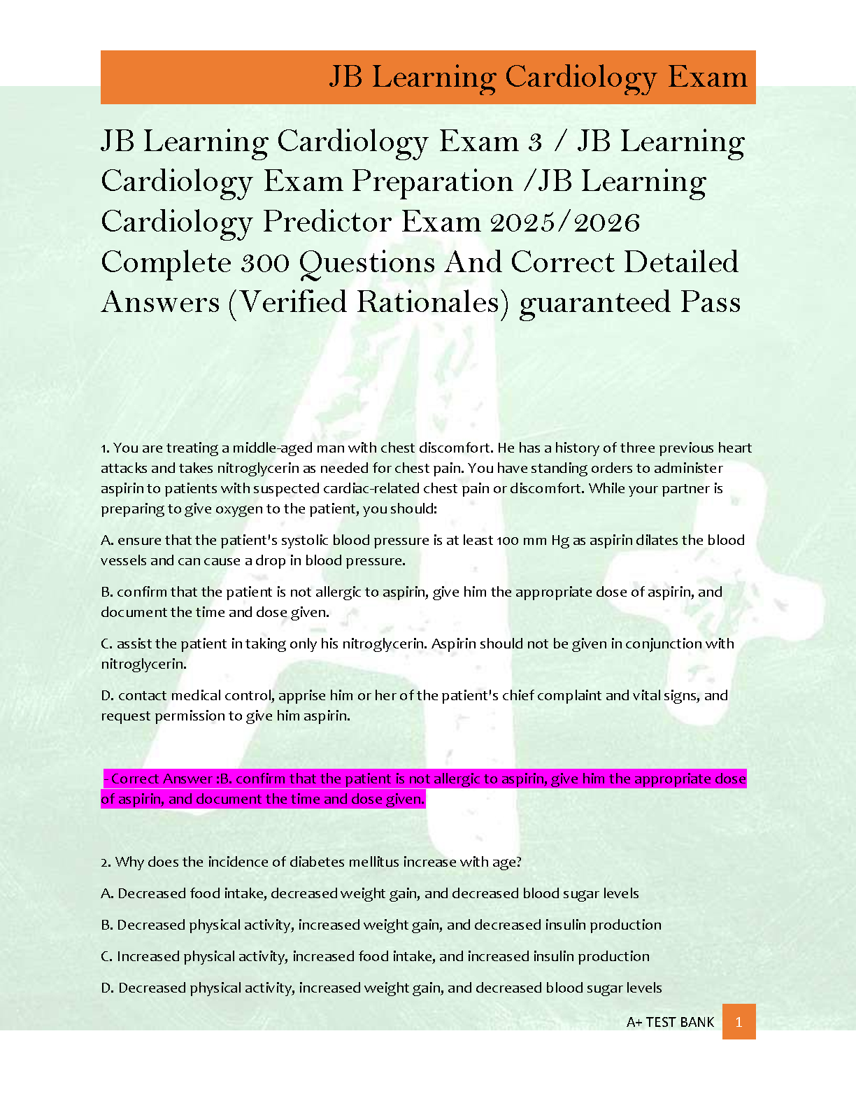 Ace your JB Learning Cardiology Exam with our complete test bank for the 2025/2026 session. This resource features 300 practice questions covering all key topics for the Cardiology Exam 3 and Cardiology Predictor Exam. Each question is paired with a detailed, verified rationale to ensure you not only know the correct answer but also understand the underlying concepts. Prepare effectively, build confidence, and guarantee your success on the first attempt with this essential study guide.
