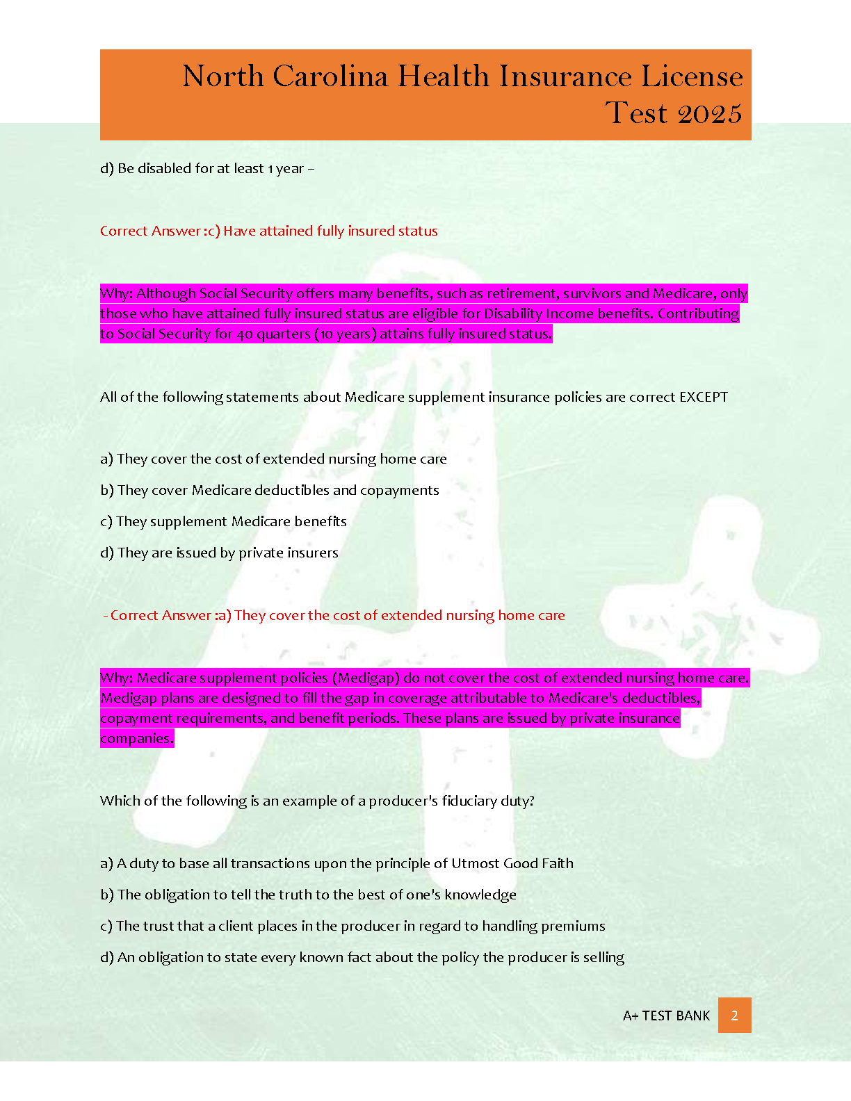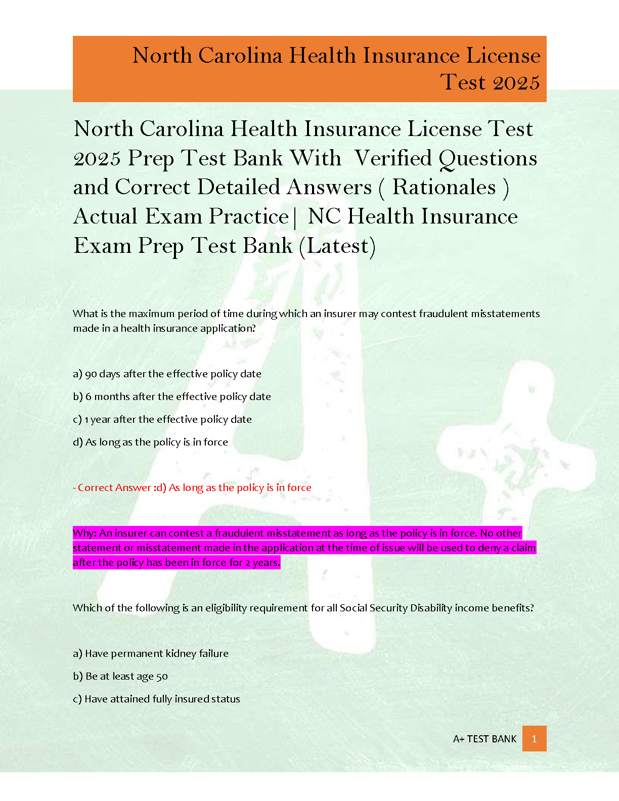 North Carolina Health Insurance License Test Bank 2025: Verified Questions, Answers, and Rationales for Exam Success