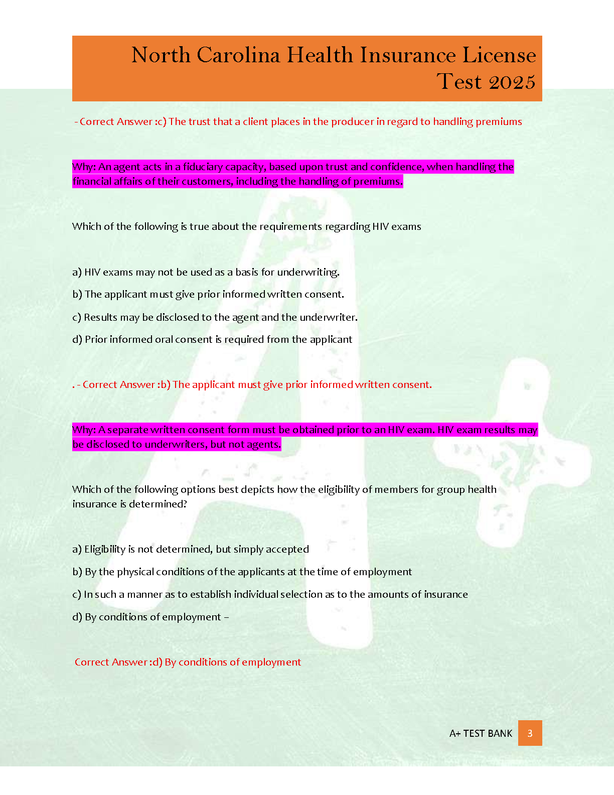 Ace your North Carolina Health Insurance License Exam on the first try with our comprehensive 2025 Test Bank. This essential study guide is packed with verified questions and detailed, correct answers complete with in-depth rationales. Mirroring the actual exam format, this practice bank provides the latest content to ensure you are fully prepared. Master the material, build confidence, and avoid costly resits with this ultimate NC Health Insurance exam prep resource.