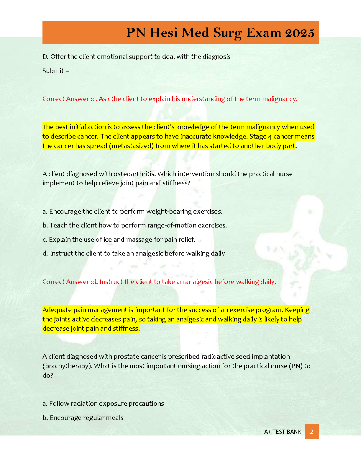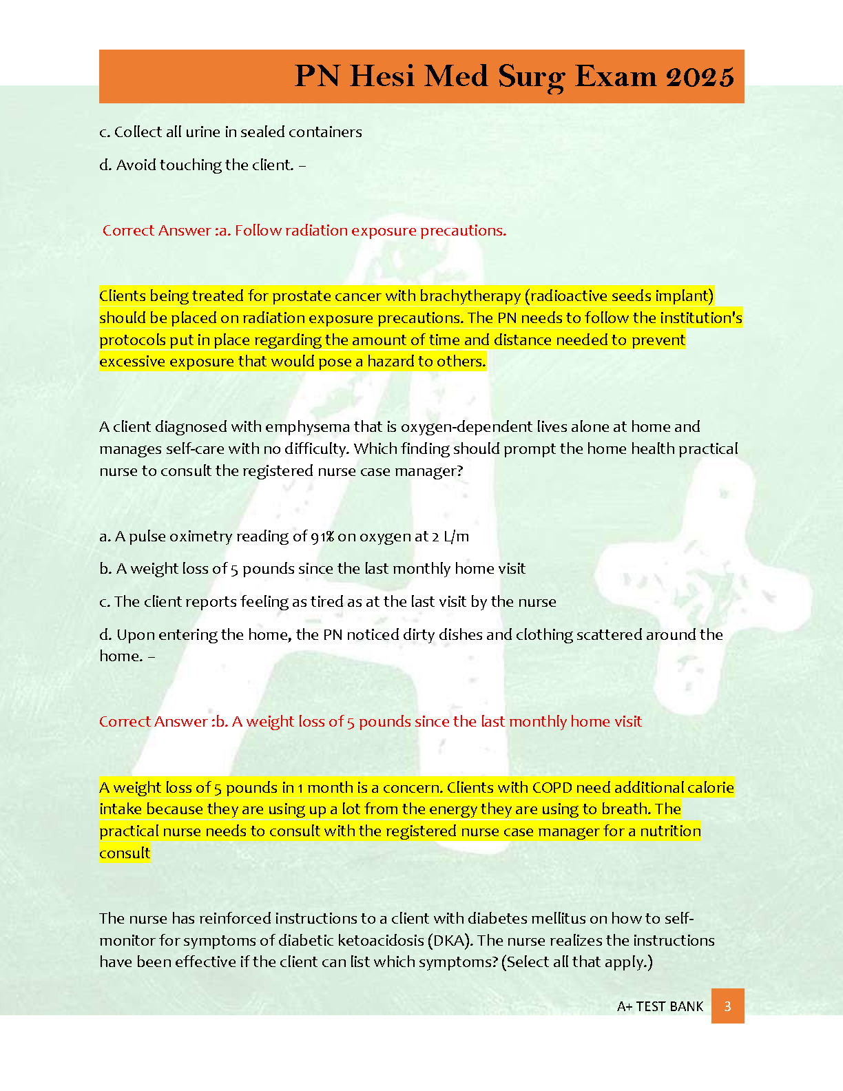 Ace your 2025 HESI PN Medical-Surgical exam with this premium test bank, featuring 300 meticulously crafted questions. Each question is paired with a correct answer and an in-depth rationale, designed to deepen your understanding of core med-surg nursing concepts. This study guide is an essential tool for nursing students aiming to master the material, build confidence, and pass their HESI exam on the first try. Covering a wide range of topics, this resource helps you identify your strengths and weaknesses for targeted study. Download now and take the first step towards exam success!