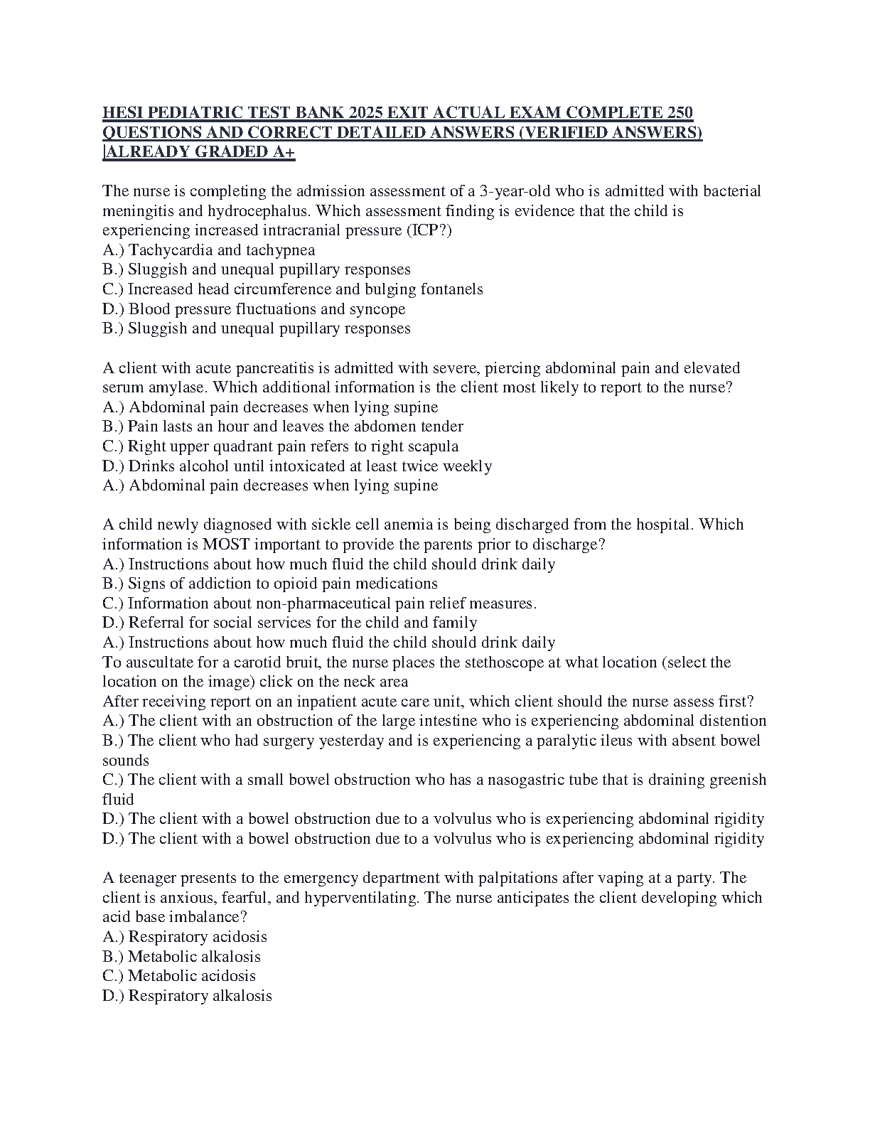 Ace your HESI Pediatric Exit Exam with confidence! This comprehensive test bank for 2025 provides you with 250 actual exam questions, each accompanied by a correct, detailed, and verified answer. Designed to help you master key pediatric nursing concepts, this resource is your ultimate tool for achieving an A+ grade. Each question is carefully selected to reflect the content of the real exit exam, ensuring you are fully prepared and can avoid resits. Download now to start practicing with the most up-to-date materials and secure your success on the first attempt!