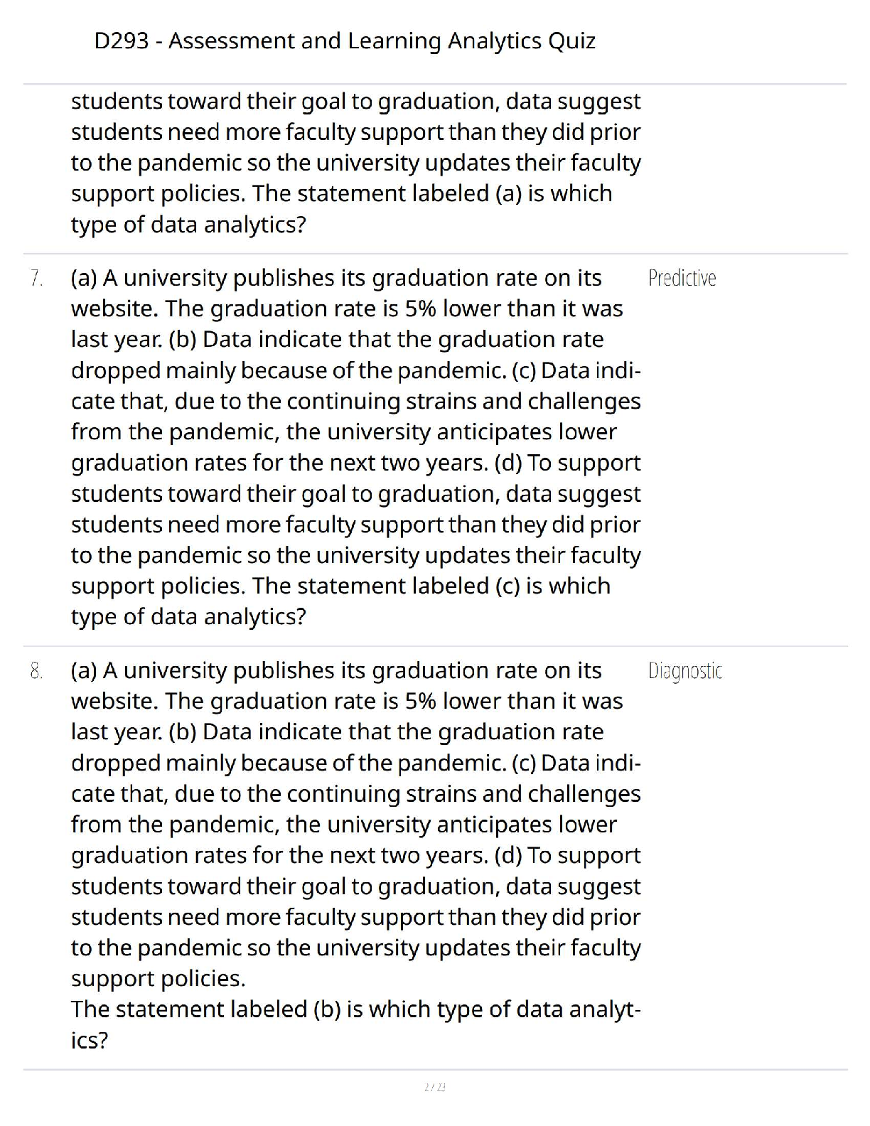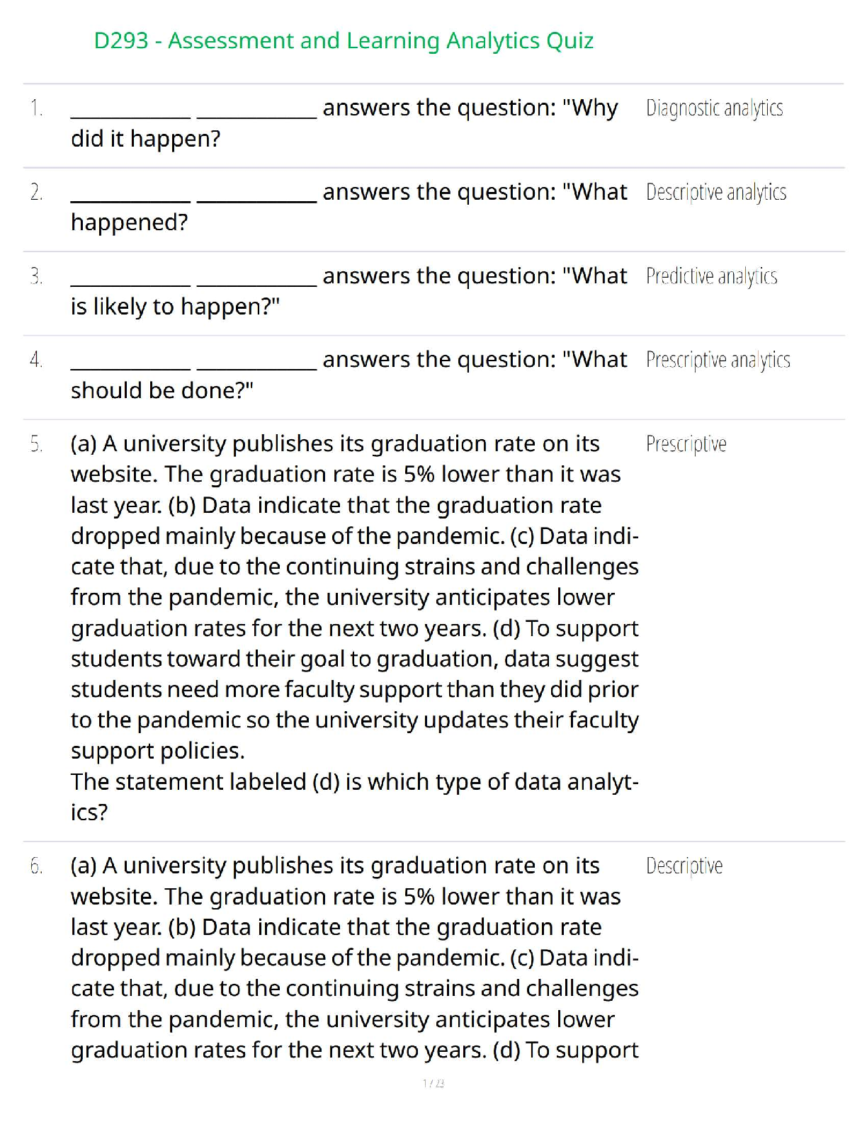 Master your WGU D293 course with our ultimate 2025/2026 test bank for Assessment and Learning Analytics. This comprehensive guide is packed with real exam questions and verified answers, covering everything from descriptive to prescriptive analytics. Perfectly crafted to help you grasp key concepts quickly, this resource is your ticket to acing the exam on your first try. Stop stressing over resits and start studying smarter with this essential prep tool.