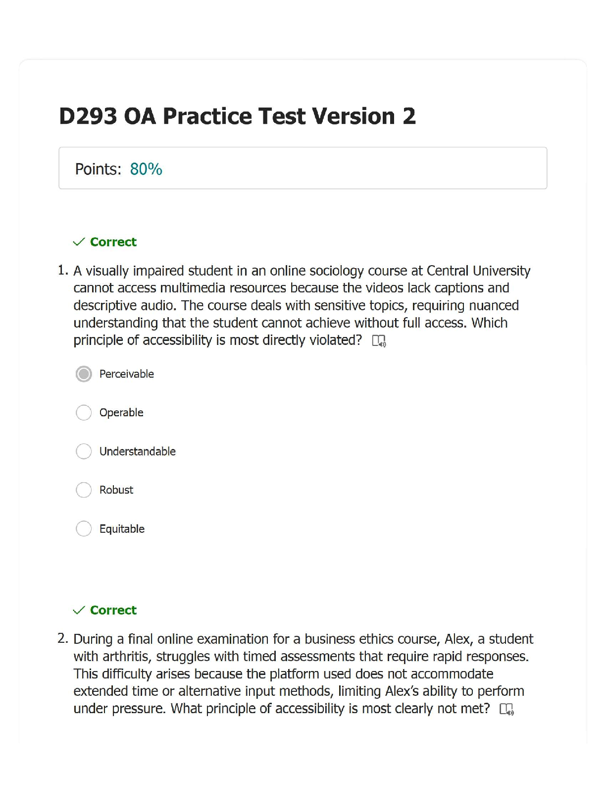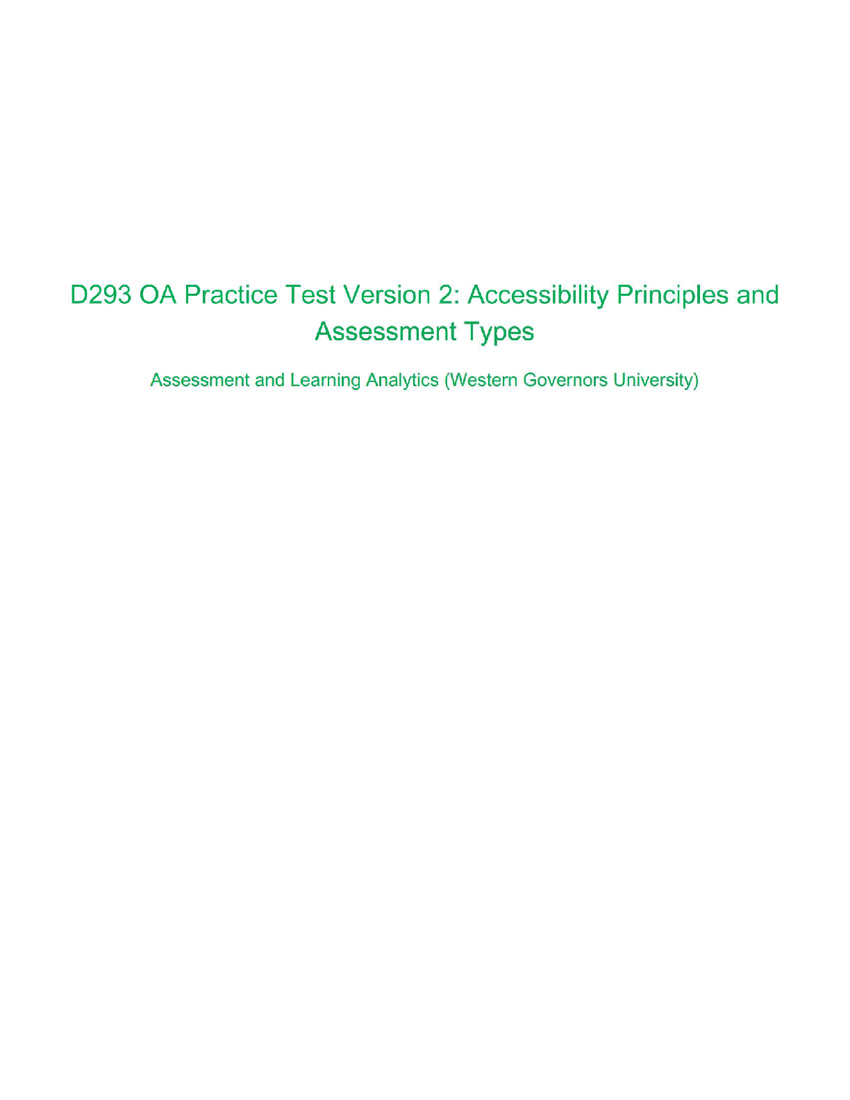 Get fully prepared for your Western Governors University exam with this comprehensive practice test for D293 Assessment and Learning Analytics. This resource is Version 2 of the OA Practice Test, focusing specifically on 'Accessibility Principles and Assessment Types'. Inside, you'll find a complete set of practice questions designed to mirror the actual objective assessment, helping you master the key concepts and pass your exam with confidence on your first try. Ideal for students looking for a reliable study guide to ace the D293 course.