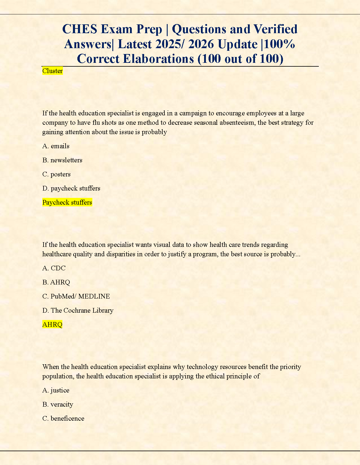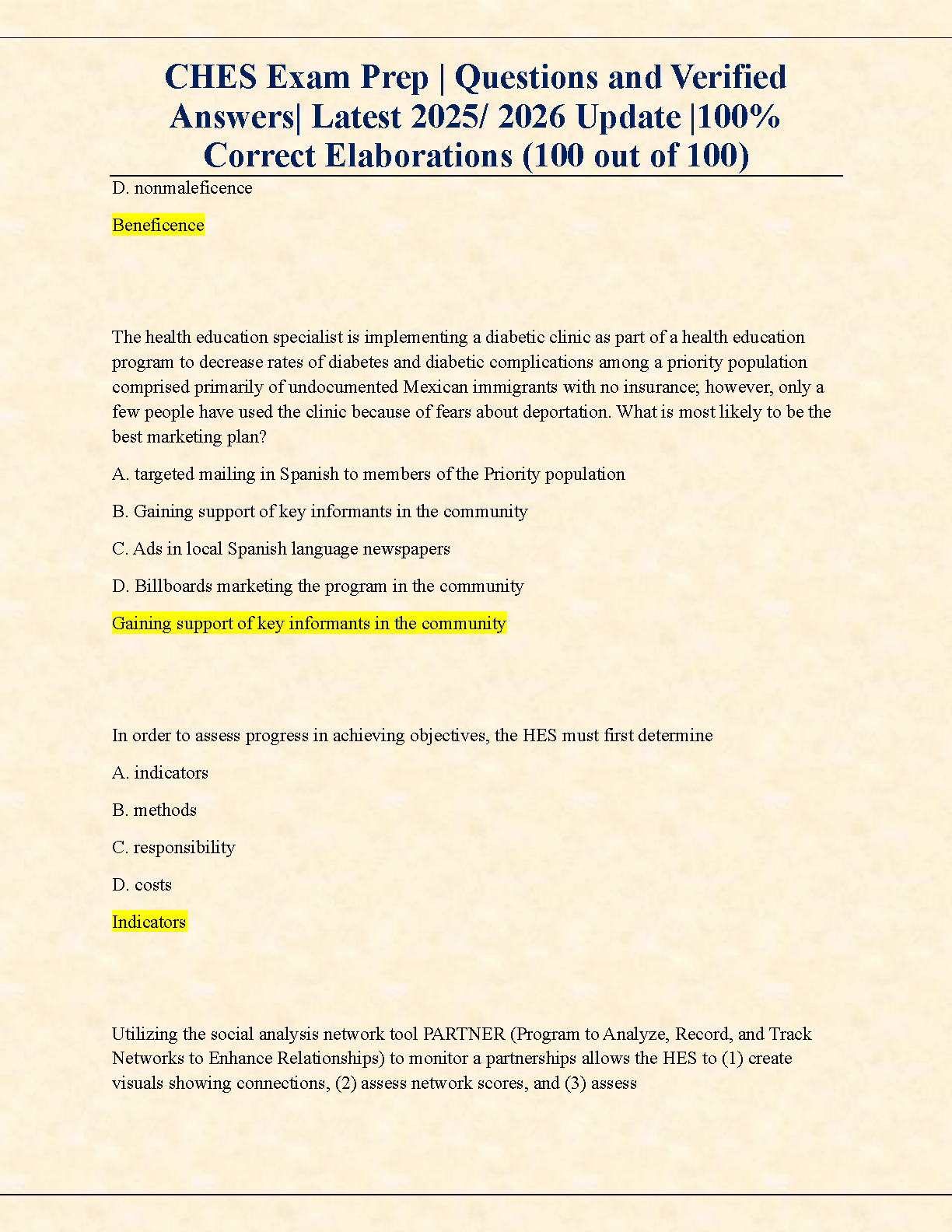 Prepare to ace the Certified Health Education Specialist (CHES) exam with our newly updated 2025/2026 study guide. This comprehensive resource is expertly designed to guarantee your success on the first attempt. Inside, you'll find an extensive collection of exam-style questions, each accompanied by a verified answer and a 100% correct elaboration. Our guide covers all critical topics, from public health interventions to ethical principles, ensuring you have the knowledge and confidence to pass with flying colors. Stop worrying about resits and start your journey to becoming a certified professional today with the ultimate CHES exam preparation tool.