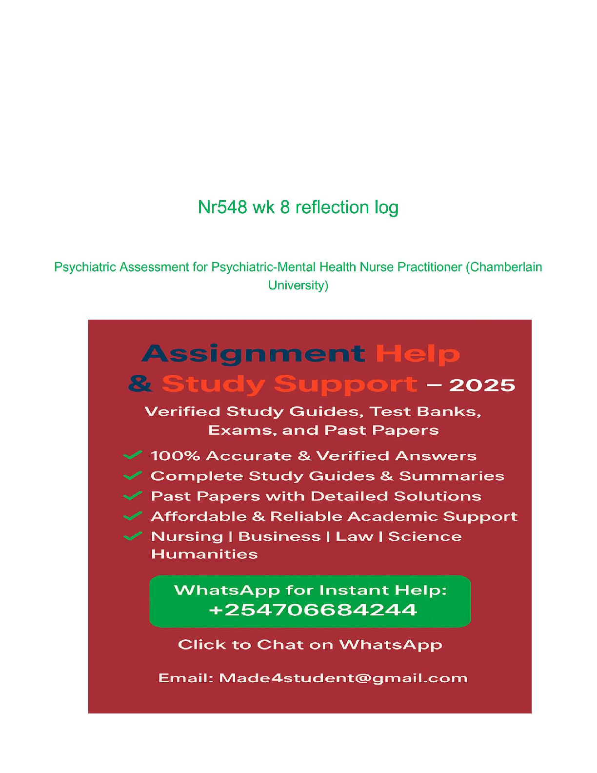 NR548 Week 8 Reflection Log: Psychiatric Assessment Guide | Chamberlain University | Latest 2025/2026 Edition to Help You Pass First Time