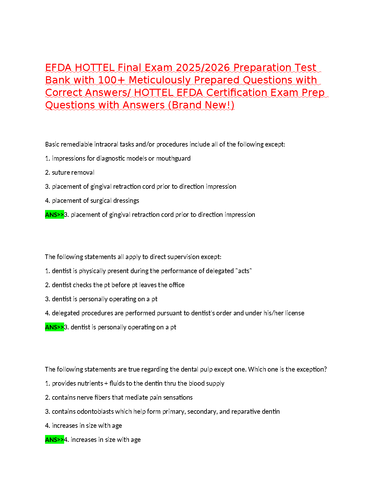 HOTTEL EFDA Final Exam Test Bank 2025/2026 | 100+ Verified Questions and Answers for Certification Success