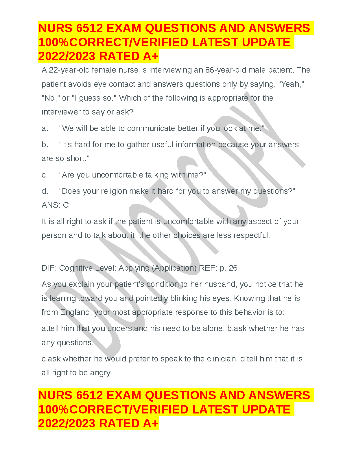 Excel in your NURS 6512 course with this comprehensive and verified test bank for 'Advanced Health Assessment & Diagnostic Reasoning, 4th Edition'. This essential study guide is meticulously updated for the 2025/2026 academic year and provides a complete collection of exam questions with detailed, 100% correct answers. Designed to help you master key concepts and prepare effectively, this A+ rated resource is your ultimate tool to ace your exams, pass on the first attempt, and avoid costly resits. Gain the confidence you need to succeed in your advanced nursing studies.