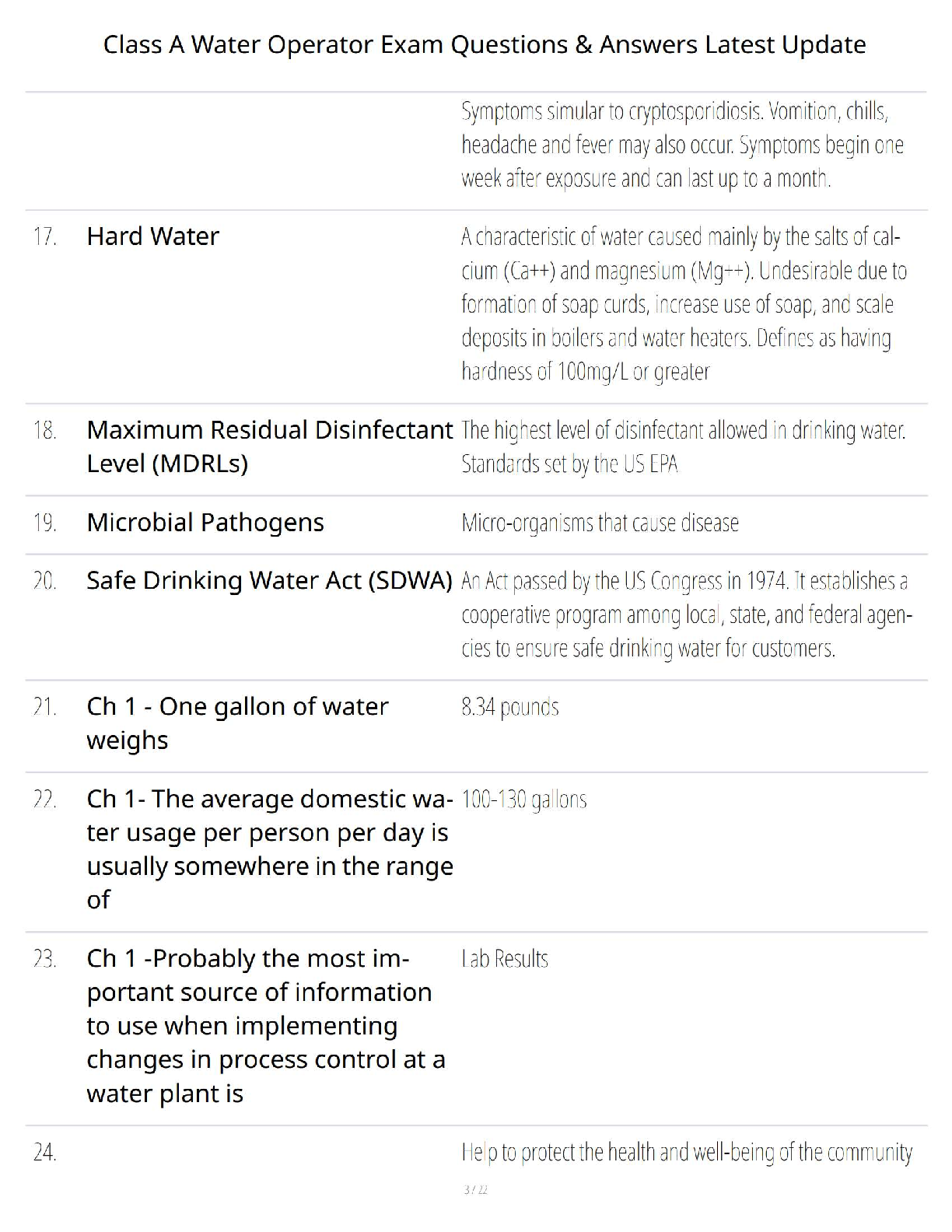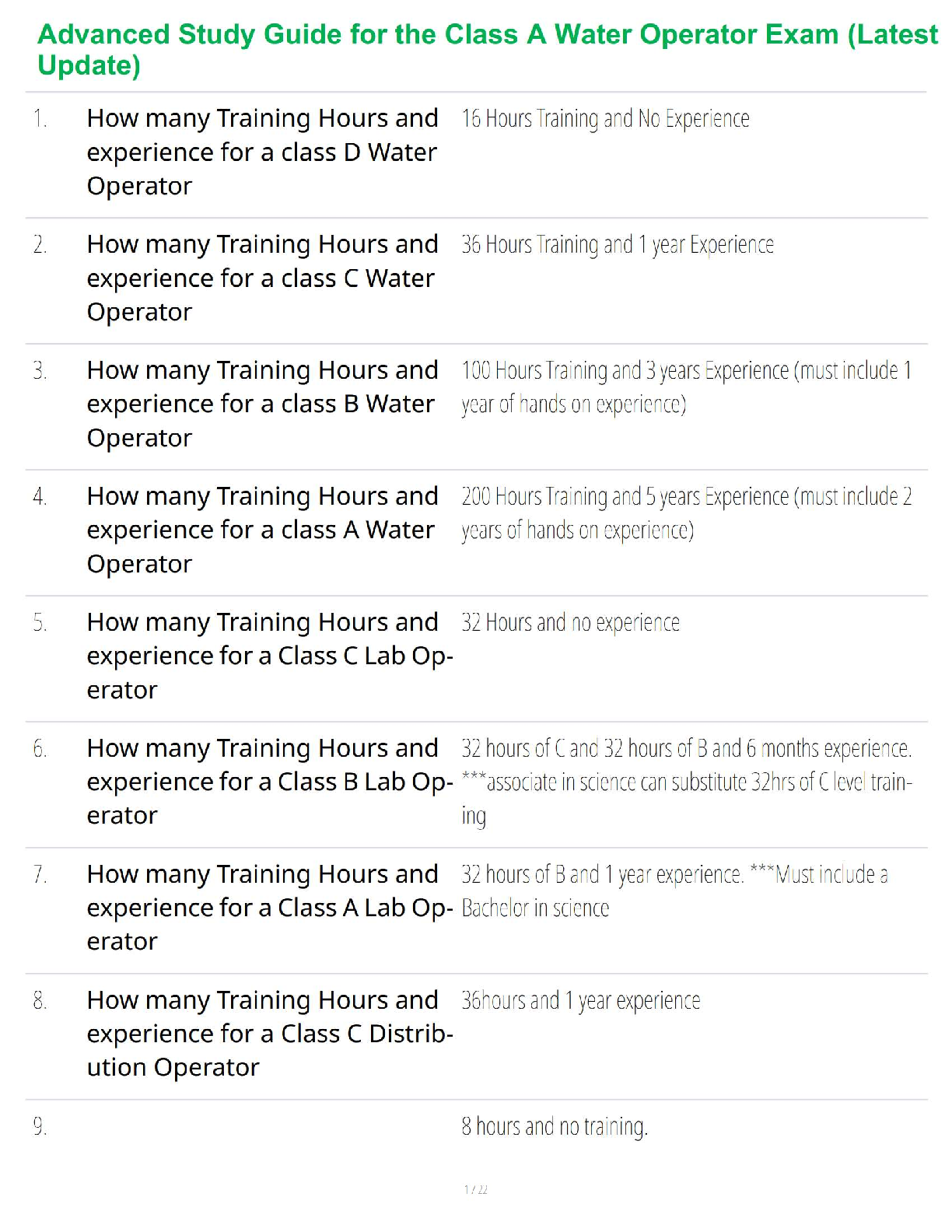 Prepare to pass your Class A Water Operator certification exam on the first try with our expertly crafted test bank, updated for the 2025/2026 academic year. This comprehensive study guide features an extensive collection of questions and detailed answers covering all essential topics, including the specific requirements for training hours and hands-on experience for every operator class (A, B, C, and D) as well as lab and distribution roles. Our clear Q&A format simplifies complex information, making it the perfect resource to build your confidence and master the material. Stop worrying about resits and secure your certification with this ultimate exam preparation tool.