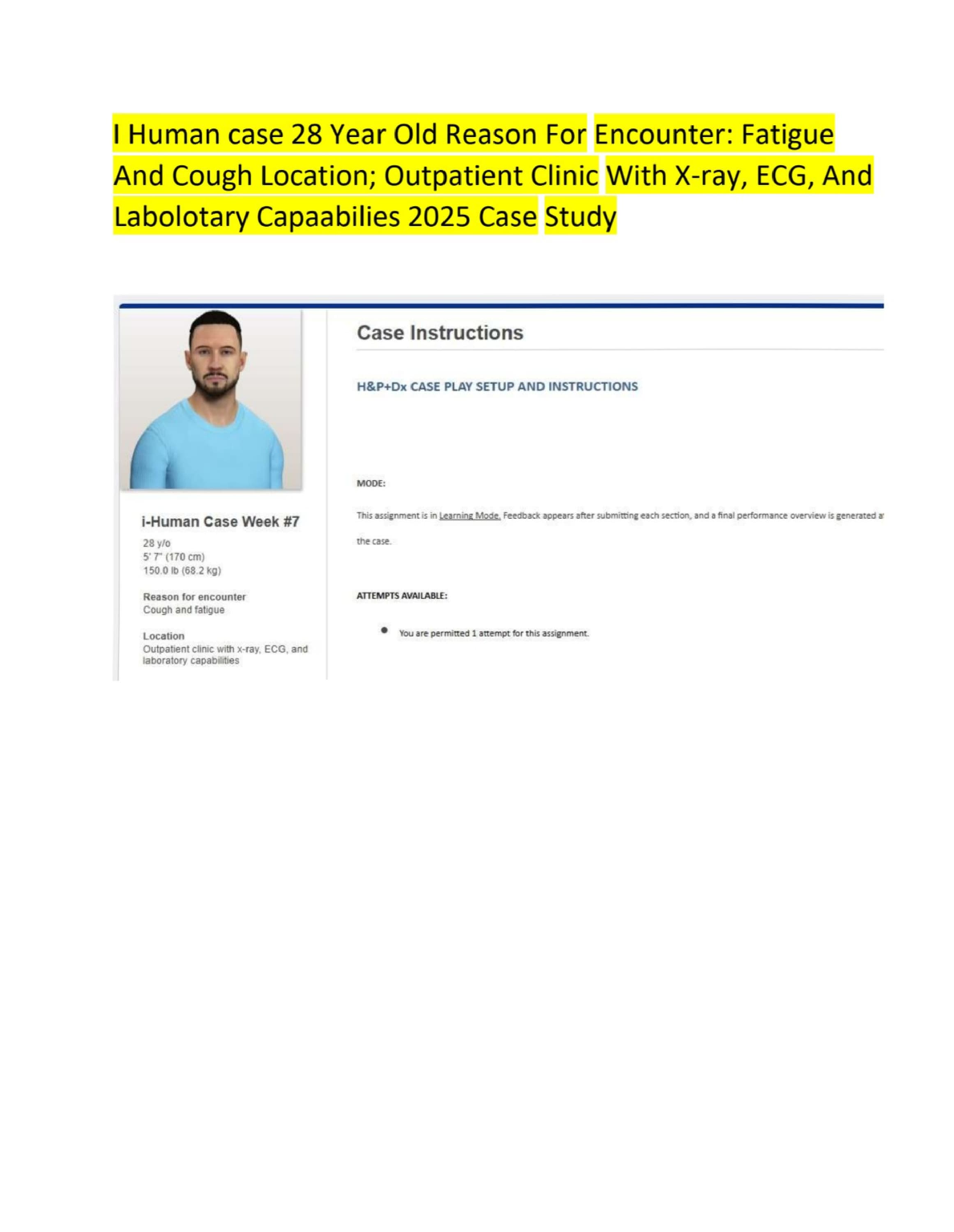 Master the i-Human Week 7 patient encounter with our comprehensive 2025/2026 case study guide. This resource provides a detailed walkthrough for the case of a 28-year-old male presenting with symptoms of fatigue and cough in an outpatient clinic setting. Learn how to effectively utilize X-ray, ECG, and laboratory capabilities to reach the correct diagnosis. This essential study aid is designed to help you excel in your i-Human assignments, understand the clinical reasoning process, and pass your exams on the very first attempt, eliminating the need for resits.