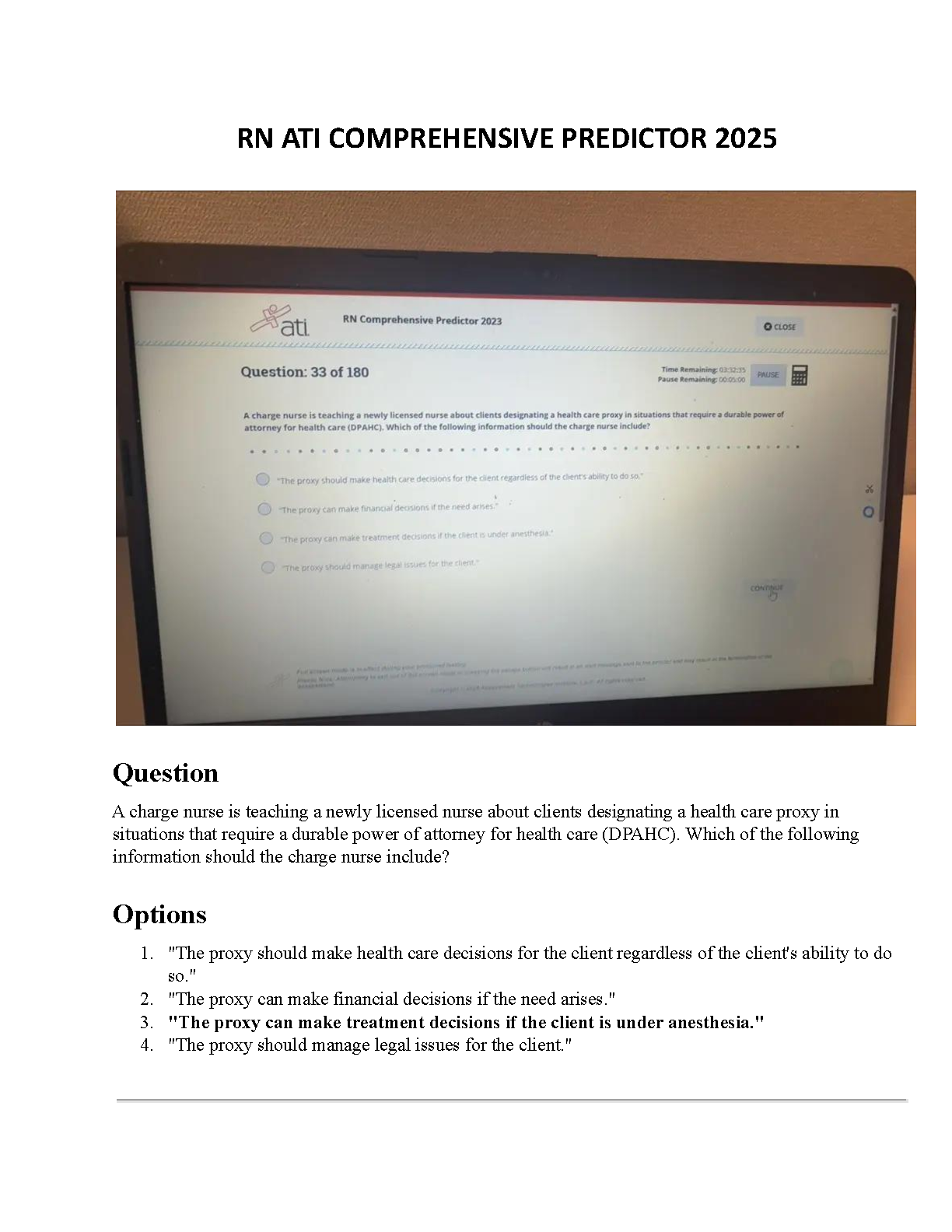 Unlock your potential and guarantee a first-time pass on your nursing exit exam with our latest RN ATI Comprehensive Predictor 2025 Test Bank. Freshly updated for the 2025/2026 academic year, this essential study resource is packed with hundreds of authentic exam questions and detailed, verified answers. Master complex topics, such as the durable power of attorney for health care (DPAHC), and build the confidence needed to excel. Avoid the stress and expense of resits by preparing with the most effective tool designed for success.