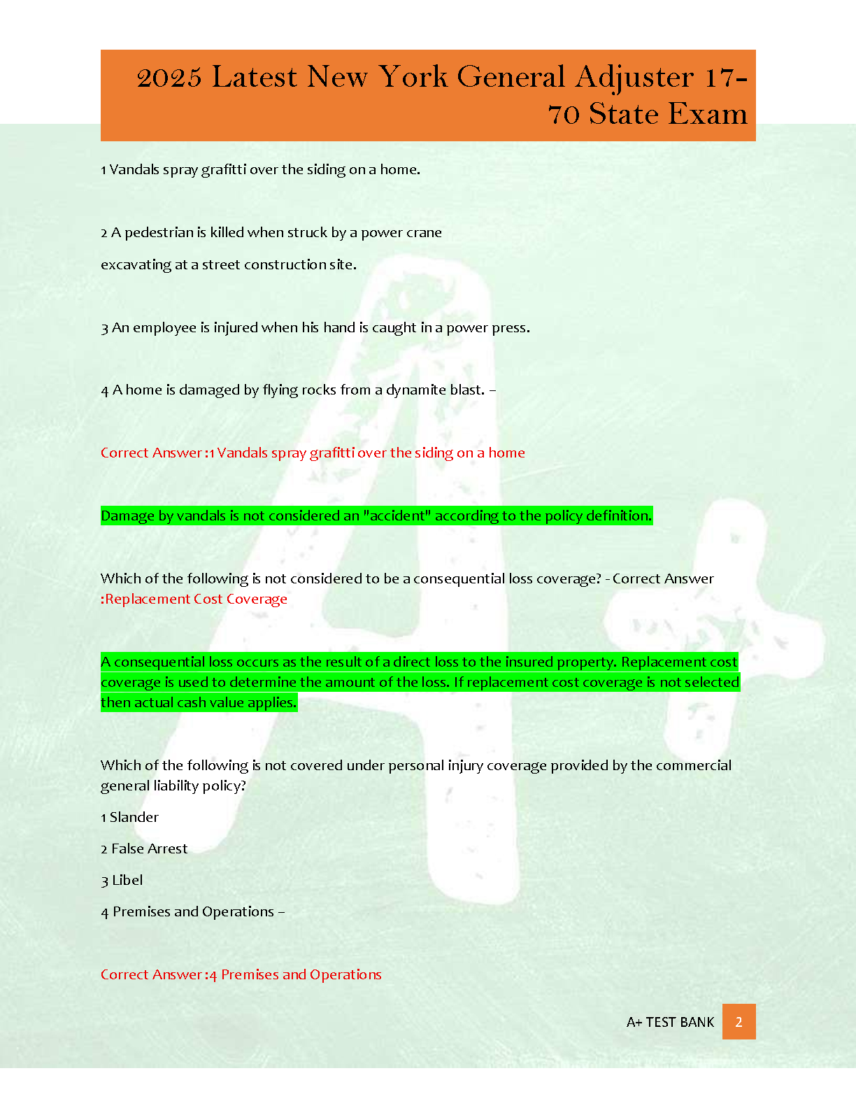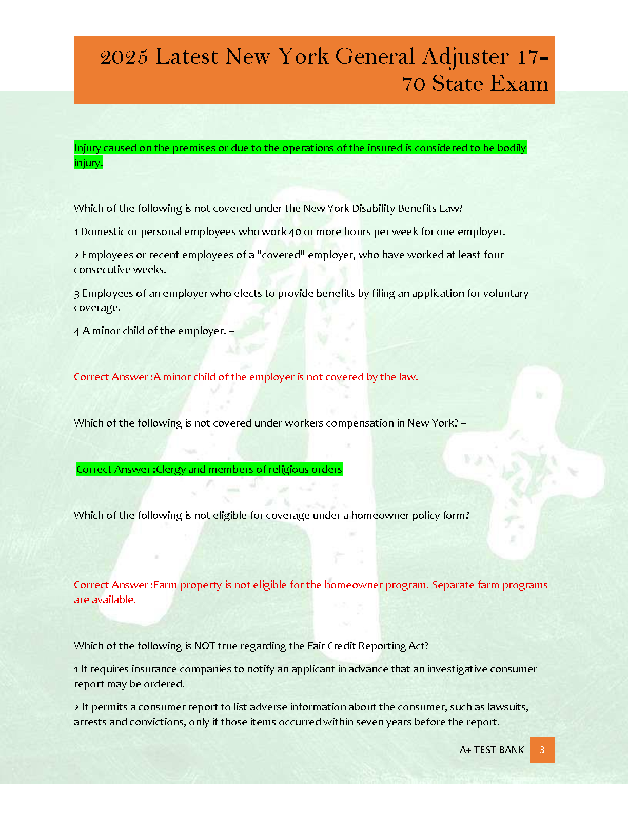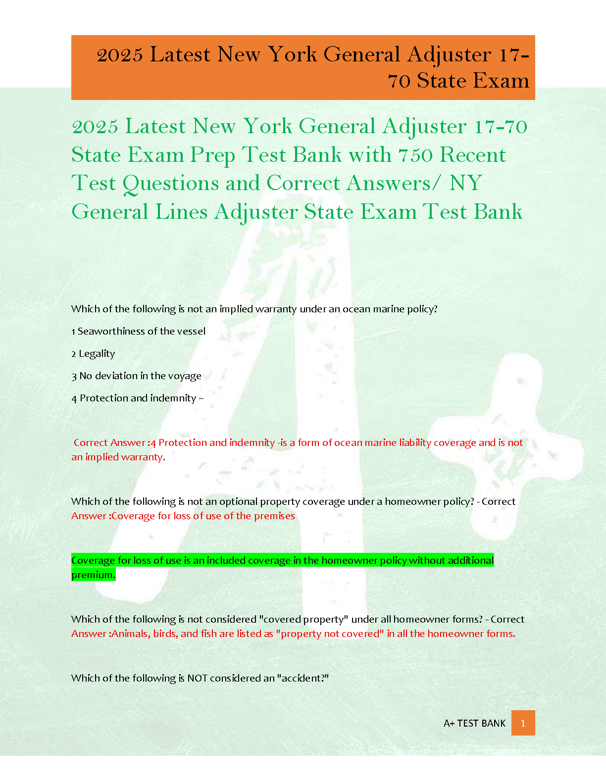 Ace your New York General Adjuster 17-70 State Exam on the first try with our latest 2025 edition test bank. This comprehensive resource is packed with over 750 meticulously curated practice questions and detailed, verified answers. Designed to mirror the actual exam format, this study guide covers all essential topics, ensuring you are fully prepared to earn your NY General Lines Adjuster license without the stress of resits. Get instant access to the ultimate preparation tool and pass with confidence!