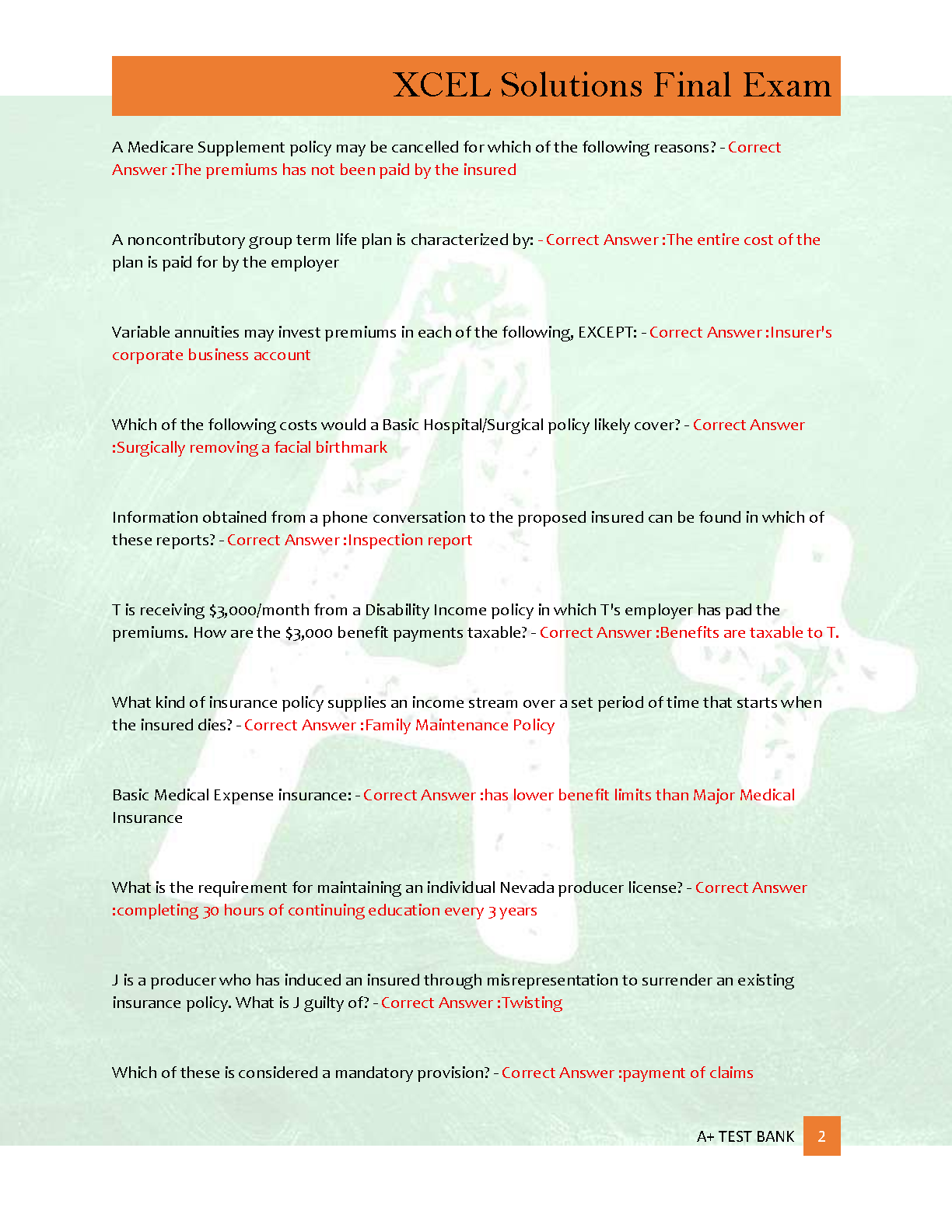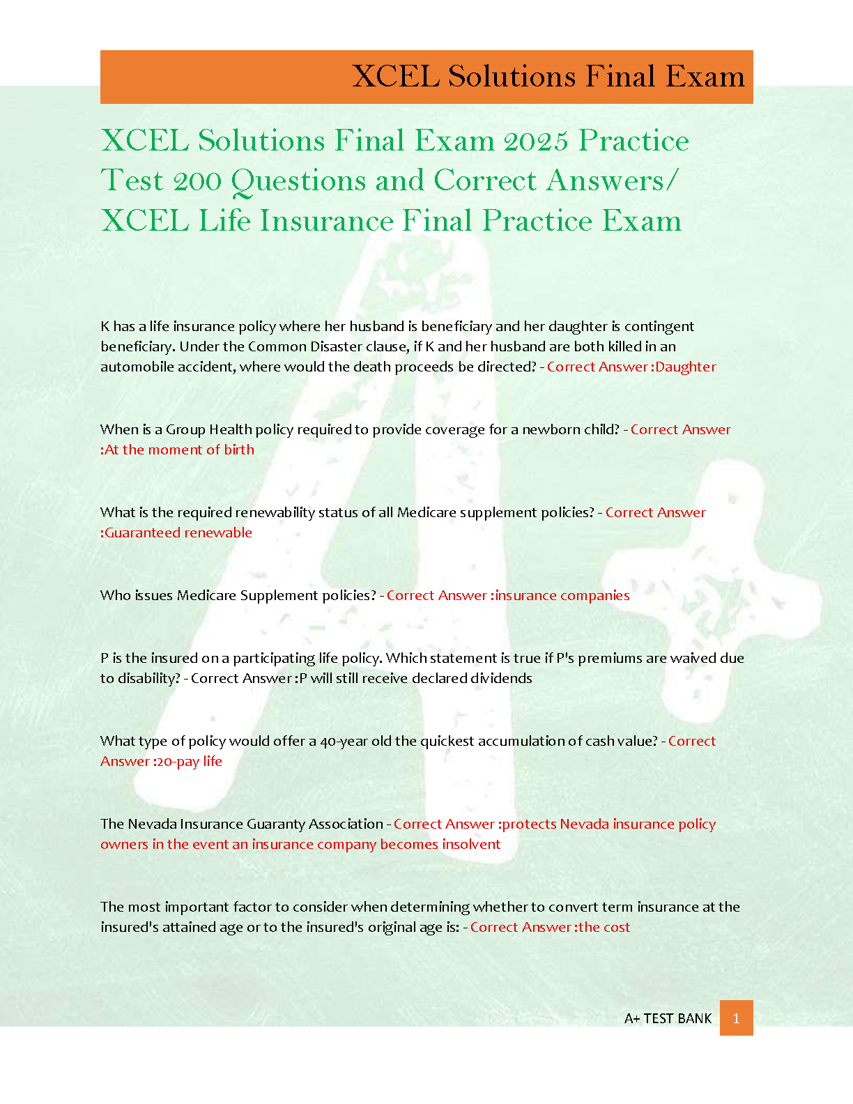 Prepare to ace your XCEL Life Insurance final exam with confidence using our comprehensive 2025 A+ Test Bank. This essential study guide features 200 meticulously curated practice questions, complete with verified correct answers, designed to cover every key topic you'll face. From policy specifics and disaster clauses to Medicare supplements, this resource is your ultimate tool for passing on the first attempt. Master the material, avoid costly resits, and get one step closer to your insurance license.