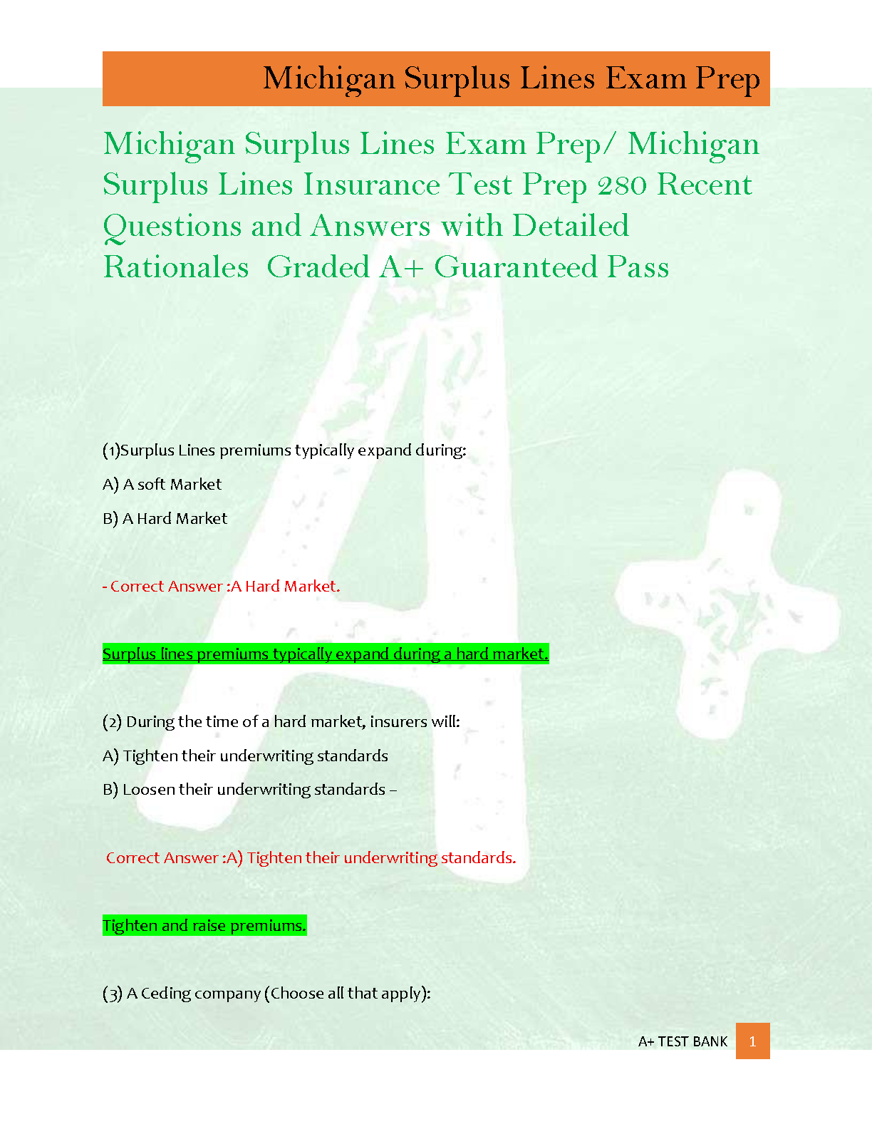 Master the Michigan Surplus Lines Exam: A+ Graded Test Bank with 280 Q&A and Detailed Rationales