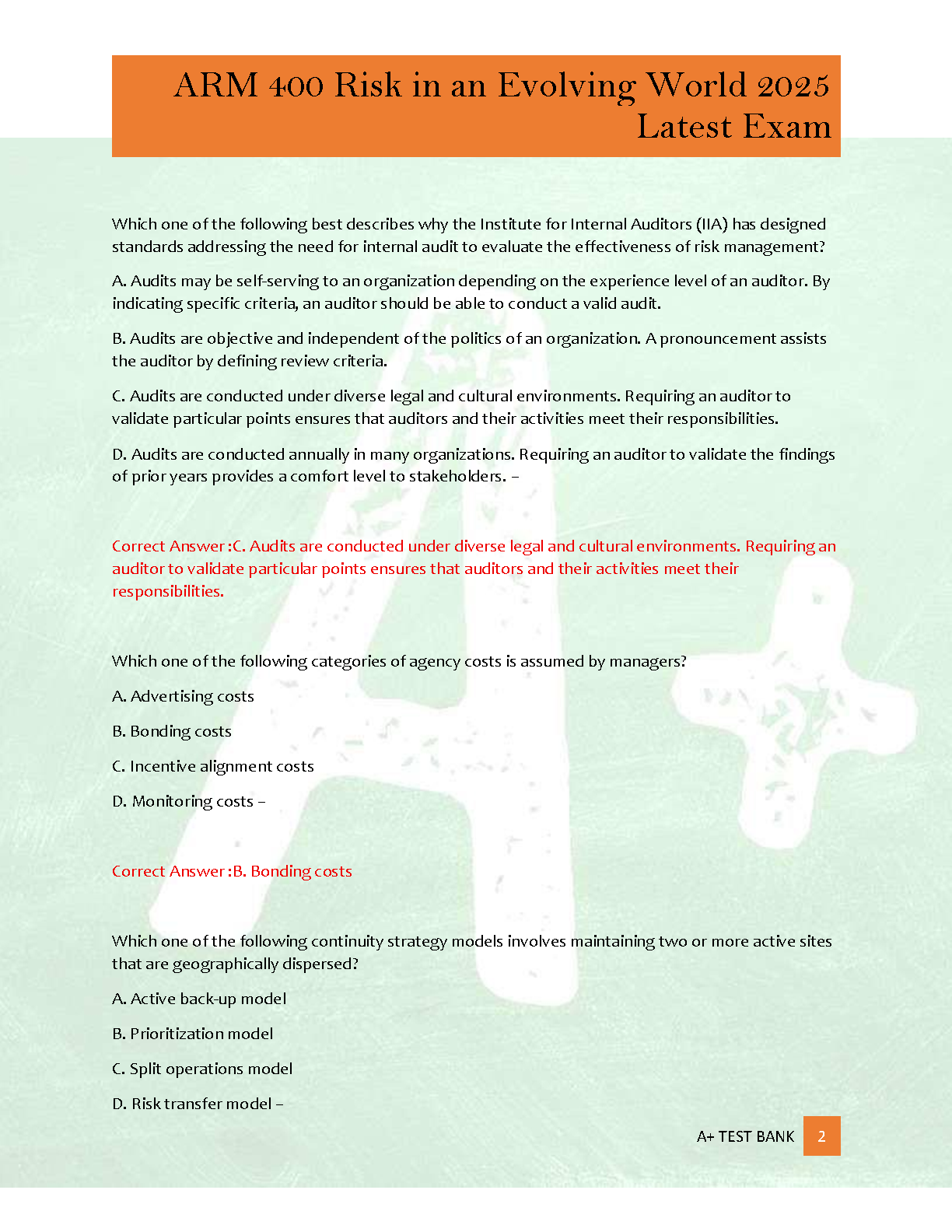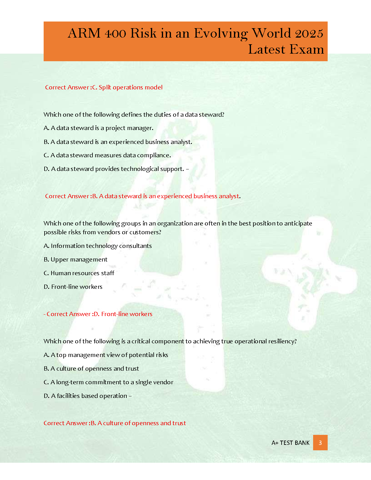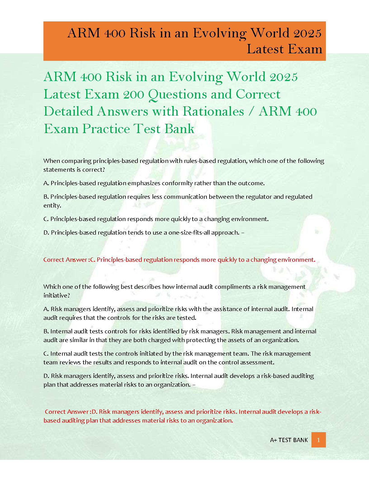 Master the ARM 400 exam with our comprehensive test bank for 'Risk in an Evolving World' by The Institutes. This 2025 edition features over 200 authentic exam-style questions, each accompanied by a correct, detailed answer and a thorough rationale to deepen your understanding. Designed to mirror the actual exam format, this practice test bank is your ultimate study tool to build confidence, identify knowledge gaps, and pass your ARM 400 certification on the very first try. Stop worrying about resits and start preparing for success today!