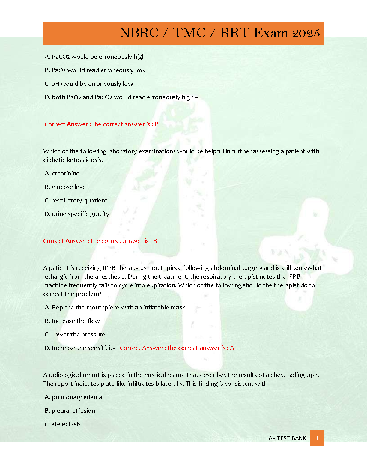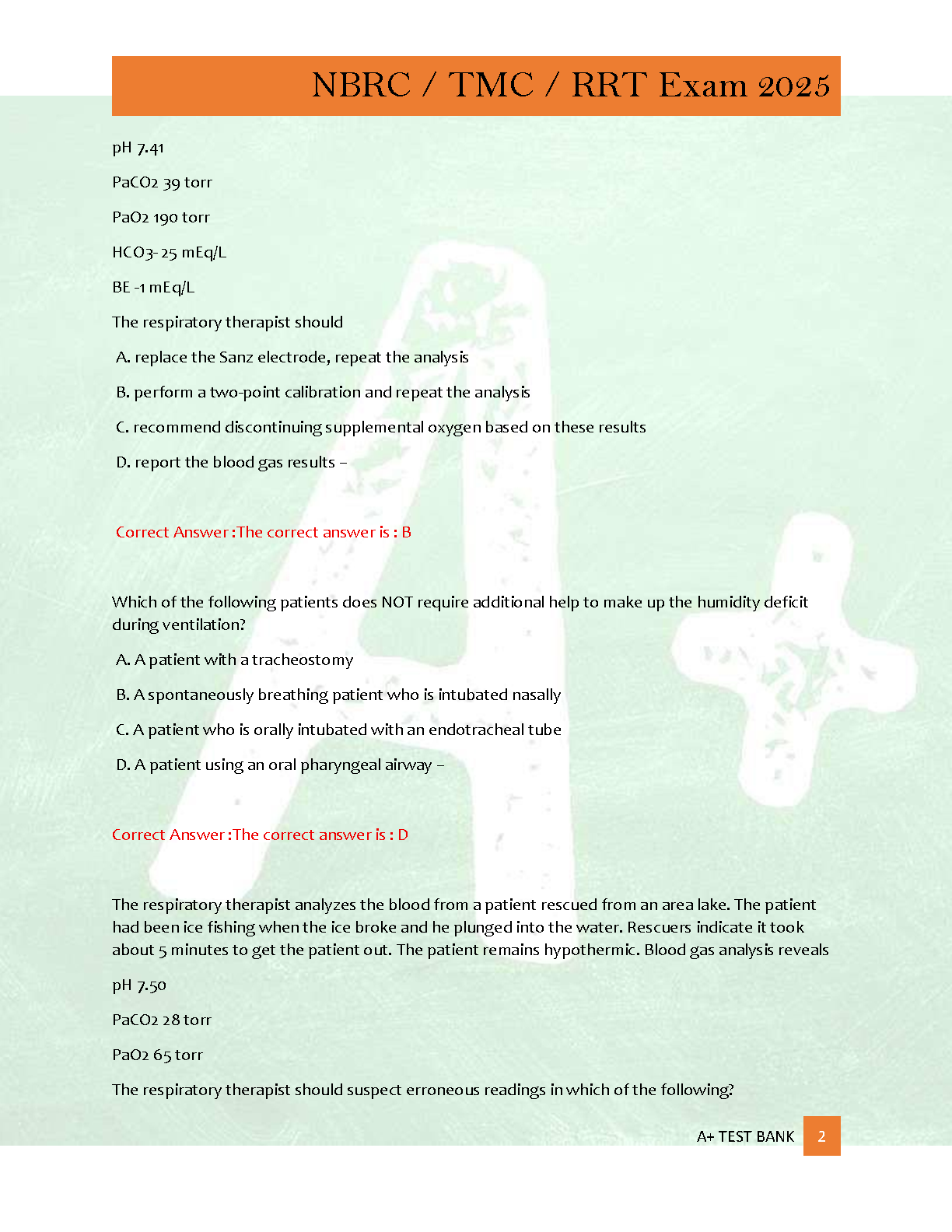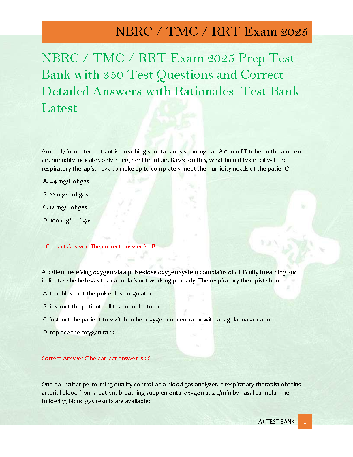 Ace your NBRC TMC / RRT certification exam on the first try with our latest 2025 Test Bank! This comprehensive study guide features 350 practice questions meticulously crafted to mirror the actual exam format. Each question comes with a correct answer and a detailed rationale, helping you understand the 'why' behind each concept. Prepare effectively, build confidence, and avoid costly resits with this essential resource for aspiring Registered Respiratory Therapists.
