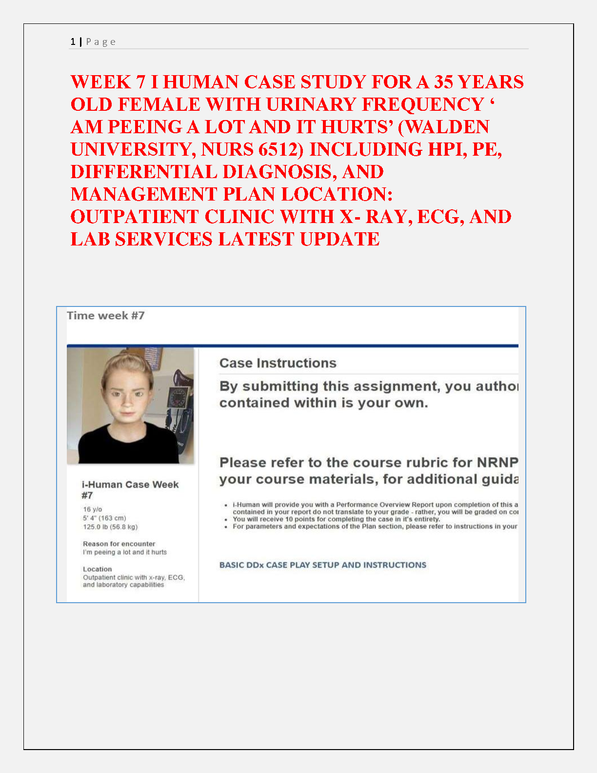 NURS 6512 Week 7 i-Human Case Study: Urinary Frequency & Dysuria | Complete HPI, DDx, & Management Plan | Walden University 2025/2026