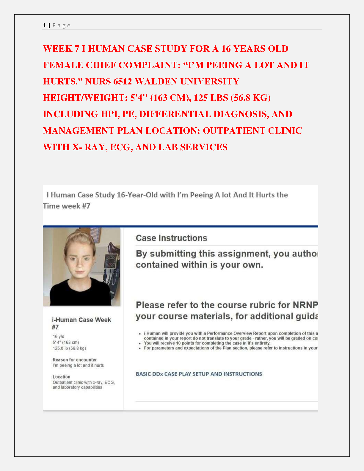 Ace your NURS 6512 course at Walden University with this comprehensive Week 7 iHuman Case Study solution, newly updated for the 2025/2026 academic year. This detailed guide covers the case of a 16-year-old female presenting with the chief complaint "I'm peeing a lot and it hurts." It provides a complete breakdown including the History of Present Illness (HPI), Physical Examination (PE), accurate Differential Diagnosis, and a thorough Management Plan. This resource is expertly designed to help nursing students understand the diagnostic process, master the iHuman simulation, and achieve top grades, ensuring you pass your exams on the first try.