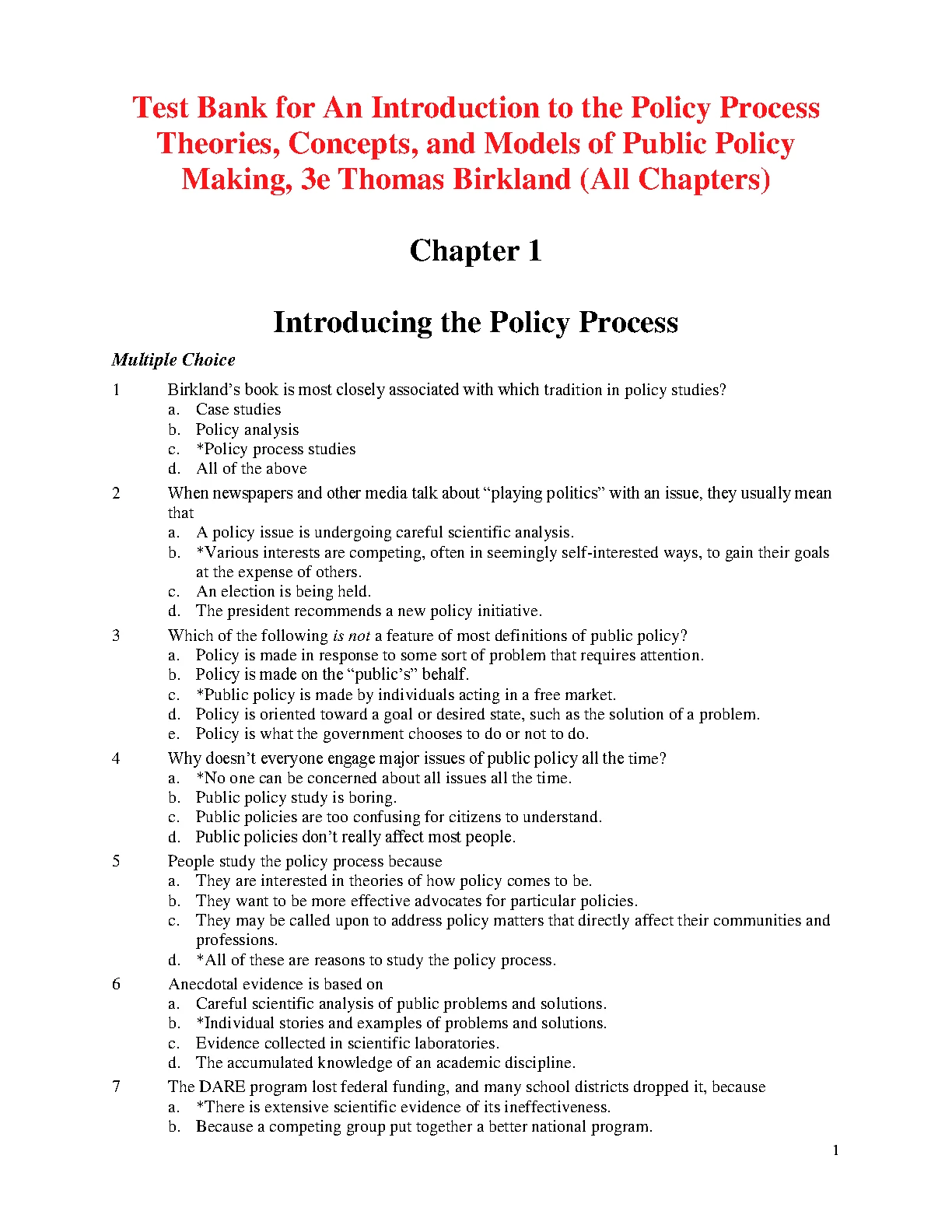 Test Bank for An Introduction to the Policy Process Theories, Concepts, and Models of Public Policy Making, 3RD EDITION BY Thomas Birkland (All Chapters)