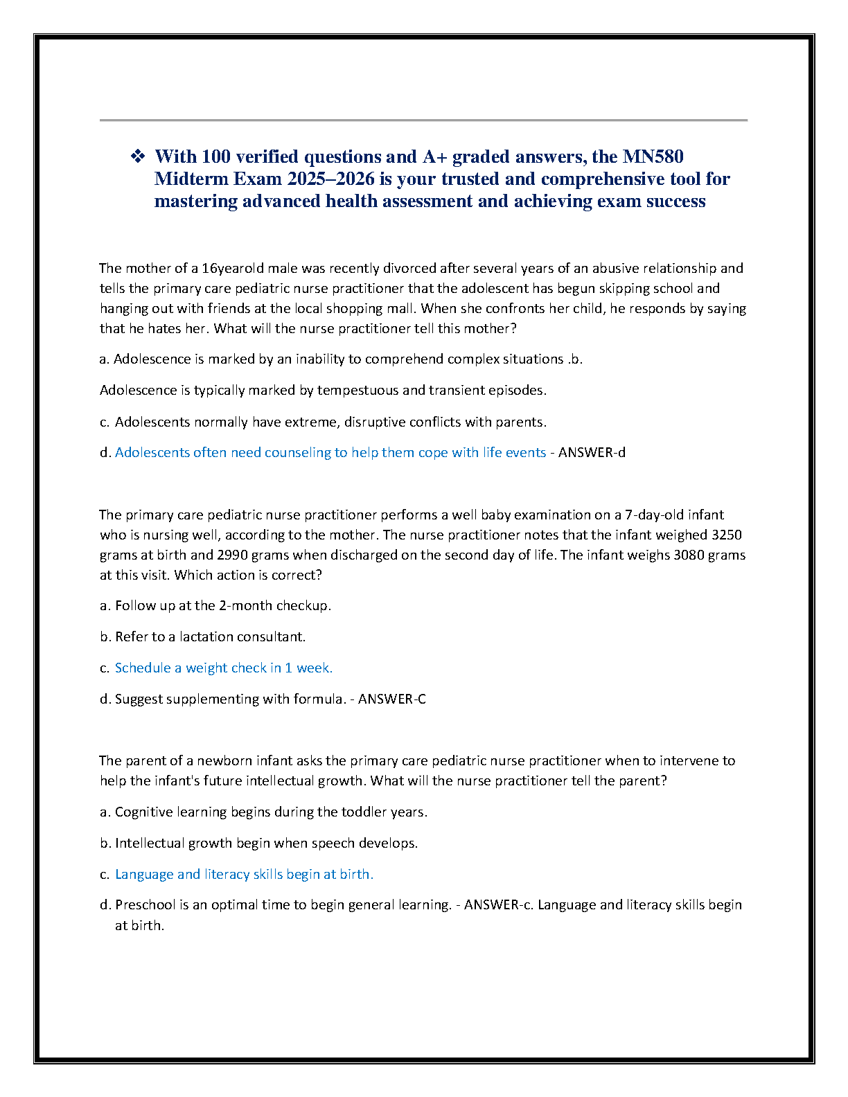 Unlock success in your MN580 Advanced Health Assessment midterm with our latest 2025-2026 test bank. This essential study resource is meticulously designed to help Nurse Practitioner (NP) students master complex topics and pass their exams on the first attempt. Inside, you'll find 100 verified exam questions complete with correct, A+ graded answers that cover all core principles of advanced health assessment and diagnostic reasoning. This prep set perfectly mirrors the actual exam's format and difficulty, providing reliable practice to strengthen your clinical thinking and boost your test-taking confidence. Prepare effectively, avoid resits, and solidify your path to success in your advanced nursing practice.