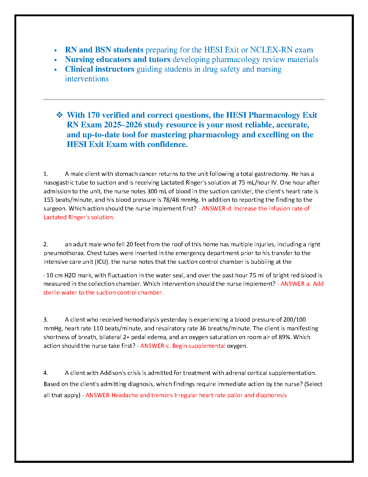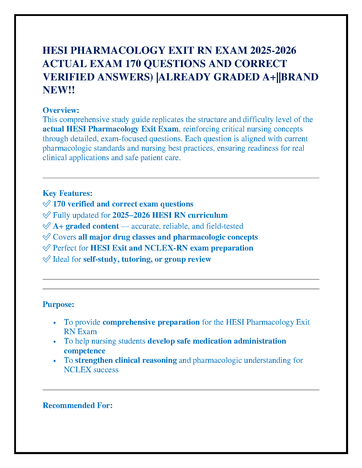 Ace your HESI Pharmacology Exit RN Exam on the first attempt with our brand-new, A+ graded study guide for the 2025-2026 academic year. This comprehensive resource is meticulously designed to mirror the actual exam's structure and difficulty, featuring 170 fully verified questions with correct answers. Each question is aligned with the latest HESI RN curriculum and nursing best practices, covering all major drug classes and essential pharmacologic concepts. Strengthen your clinical reasoning, master safe medication administration, and build the confidence you need for both your HESI Exit Exam and future NCLEX-RN success. This guide is your ultimate tool for avoiding resits and achieving top scores.