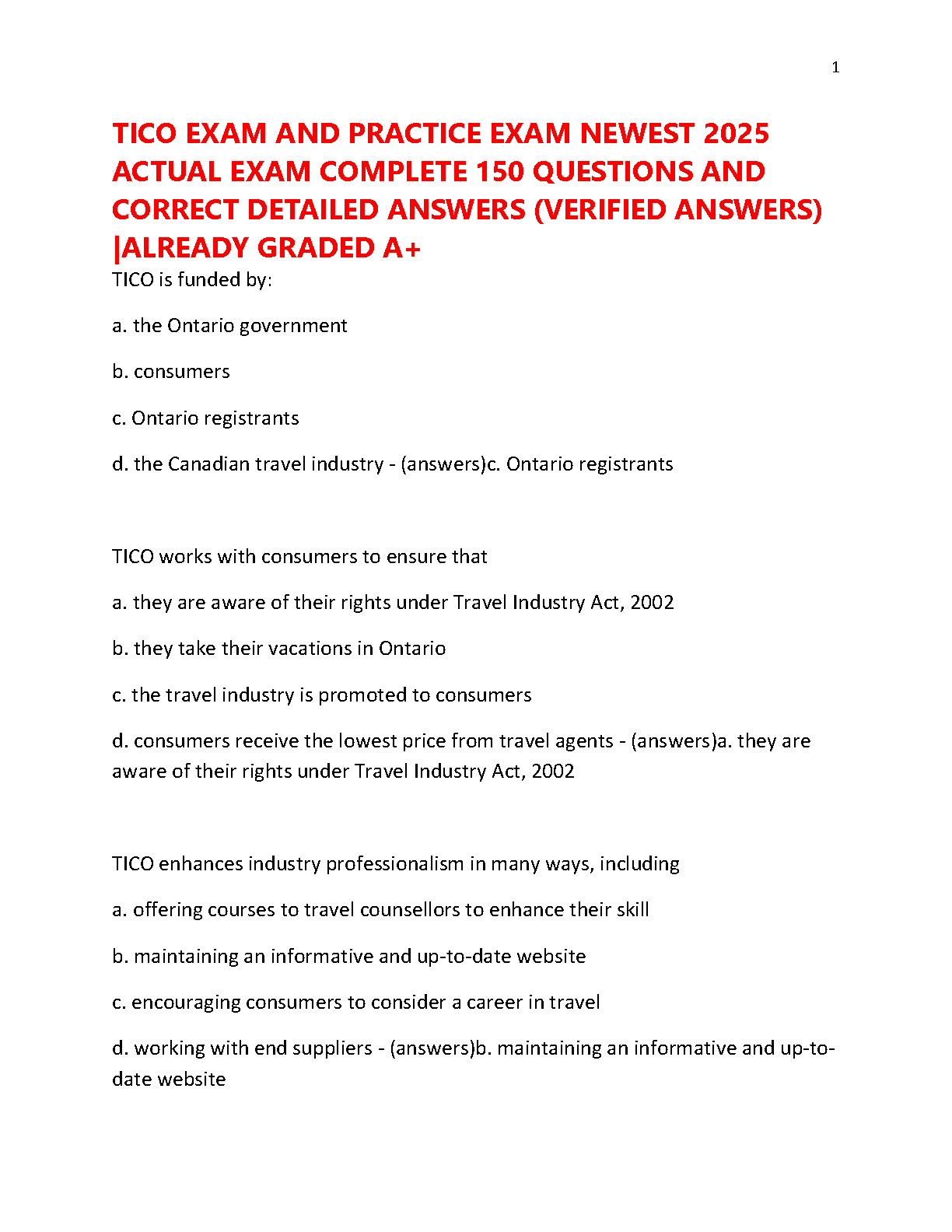 Ace your Travel Industry Council of Ontario (TICO) exam on your first attempt with this comprehensive 2025 test bank. This top-rated study guide features 150 actual exam questions, each with a correct, detailed, and verified answer. Designed to help you master the material and avoid resits, this resource is already graded A+ and is your key to becoming a certified travel professional in Ontario. Download now for the most up-to-date preparation for the 2025/2026 academic year.